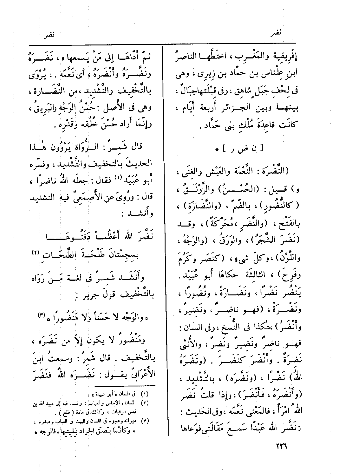 وَأنْشد شَمِرٌ فِي لُغَة من رَوَاهُ بِالتَّخْفِيفِ قولَ جَرير: والوَجهُ لَا حَسَنَاً وَلَا مَنْضُورا ومَنْضُور لَا يكون إلاّ من نَضَرَه، بِالتَّخْفِيفِ، قَالَ شَمِرٌ: وسمعتُ ابنَ الأعرابيّ يَقُول: نَضَرَه اللهُ فَنَضَر