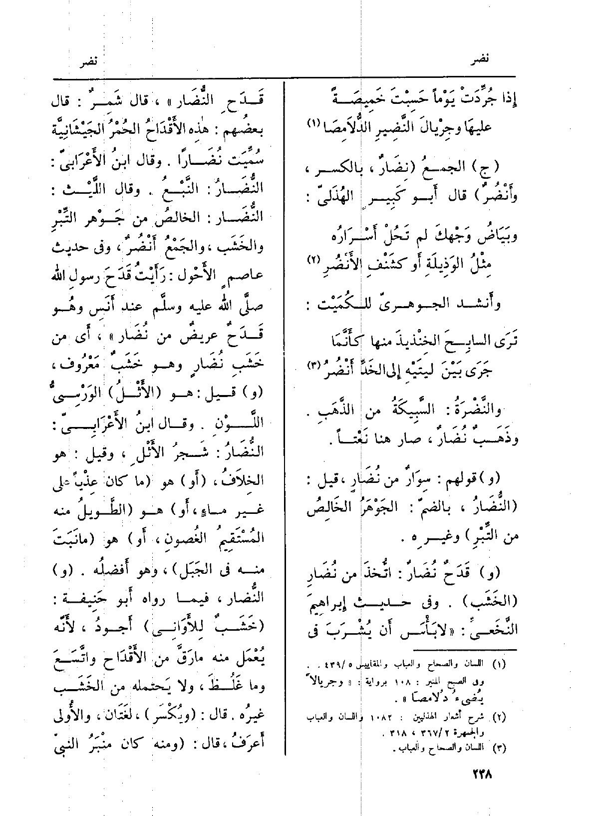 والنَّضْرَة: السَّبيكَةُ من الذَّهَب. وَذَهَبٌ نُضَارٌ، صَار هُنَا نَعْتَاً. قَوْلهم: سِوارٌ من نُضار، قيل: النُّضار، بالضمّ: الجَوْهرُ الْخَالِص من التِّبْر وغيرِه. قَدَحٌ نُضارٌ: اتُّخِذَ من نُضارِ الخِشَب. وَفِي حَدِيث إِبْرَاهِيم النَّخَعيِّ: لَا بَأْسَ أَن يُشرَبَ فِي قَدَحِ النُّضار، قَالَ شَمِرٌ: قَالَ بَعْضُهم: هَذِه الأقداحُ الحُمرُ الجَيْشانِيّة سُمِّيت نُضاراً. وَقَالَ ابْن الأَعْرابِيّ: النُّضار: النَّبْع. وَقَالَ اللَّيْث: النُّضار: الخالصُ من جَوْهَر التِّبْر والخشب، والجمعُ أَنْضُرٌ، وَفِي حَدِيث عاصمٍ الأحْول: رَأَيْتُ قَدَحَ رَسُول الله صلّى الله عَلَيْهِ وسلَّم عِنْد أنسٍ وَهُوَ قَدَحٌ عريضٌ من نُضار، أَي من خشبِ نُضَارٍ وَهُوَ خشبٌ مَعْرُوف، قيل: هُوَ الأَثْلُ الوَرْسِيُّ اللَّوْن. وَقَالَ ابْن الأَعْرابِيّ: النُّضَار: شجرُ الأَثْل، وَقيل: هُوَ الخِلاف، أَو هُوَ مَا كَانَ عِذْياً على غيرِ ماءٍ، أَو هُوَ الطويلُ مِنْهُ المُستَقيمُ الغُصون، أَو هُوَ مَا نَبَتَ مِنْهُ فِي الْجَبَل، وَهُوَ أفضلُه. النُّضار، فِيمَا رَوَاهُ أَبُو حنيفَة: خشبٌ للأواني أجودُ، لِأَنَّهُ يُعمَل مِنْهُ مَا رقَّ من الأقداحِ واتَّسَعَ وَمَا غَلُظ، وَلَا يحْتَملهُ من الْخشب غيرُه. قَالَ: ويُكسَر، لُغَتان، والأُولى أَعْرَف، قَالَ: وَمِنْه كَانَ مَنْبَرُ النبيّ صلّى الله