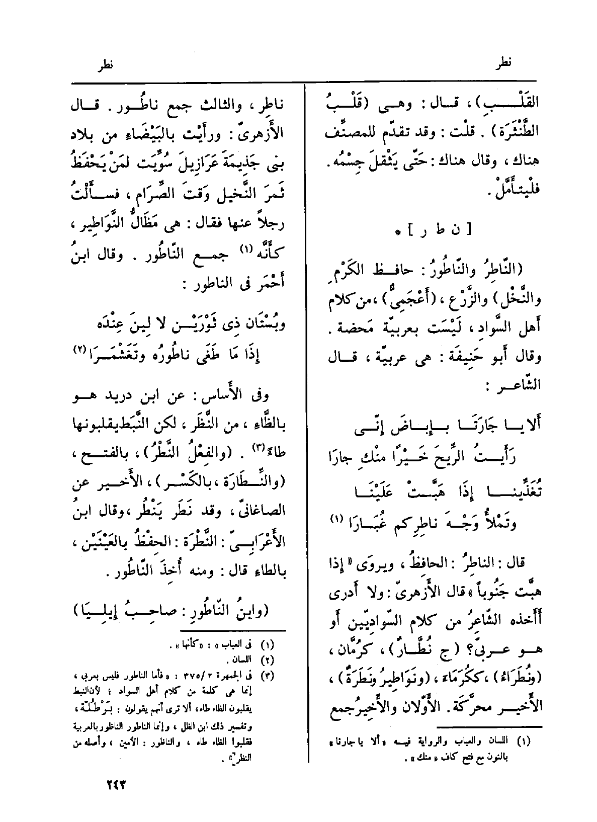النَّاطِرُ والنّاطور: حَافظ الكَرْمِ والنَّخْل والزَّرْع، أعجمِيٌّ، من كَلَام أهلِ السَّوادِ، ليستْ بعربيّة مَحْضَة. وَقَالَ أَبُو حنيفَة: هِيَ عربيّة، قَالَ الشَّاعِر: