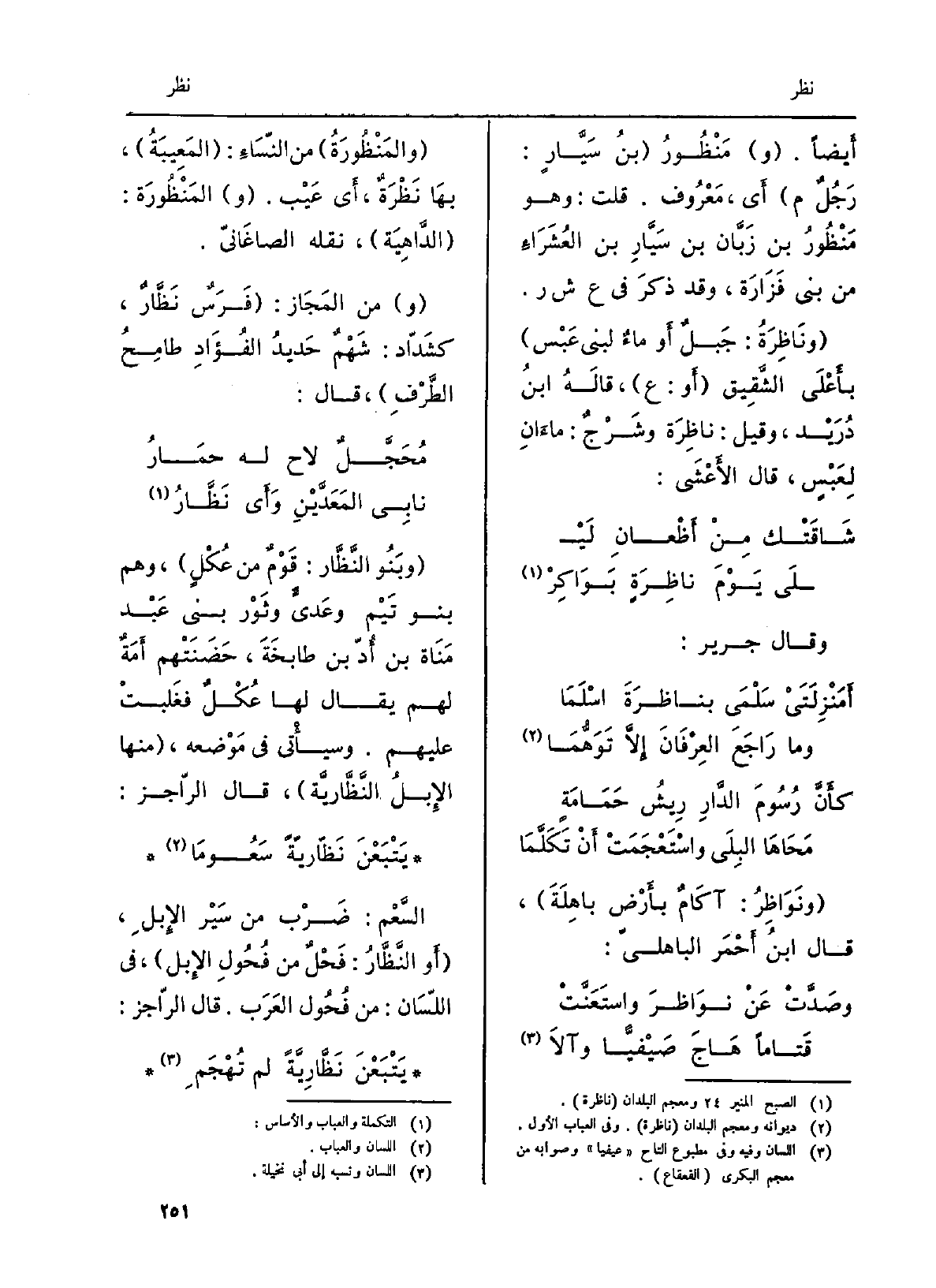 وبَنو النَّظَّار: قومٌ من عُكْل، وهم بَنو تَيْم وعَديٍّ وثوْر بني عَبْد مَناة بن أُدّ بن طابِخَة، حَضَنَتْهم أَمَةٌ لَهُم يُقَال لَهَا عُكْلٌ فَغَلَبتْ عَلَيْهِم. وَسَيَأْتِي فِي مَوْضِعه، مِنْهَا الإبلُ النَّظَّاريَّة، قَالَ الراجز: يَتْبَعْنَ نَظَّاريّةً سَعُوما السَّعْم: ضَرْب من سَيْرِ الْإِبِل، أَو النَّظَّار: فَحْلٌ من فحولِ الْإِبِل، فِي اللِّسَان: من فُحولِ الْعَرَب. قَالَ الراجز: يَتْبَعْنَ نَظَّاريّةً لم تُهجَمِ)