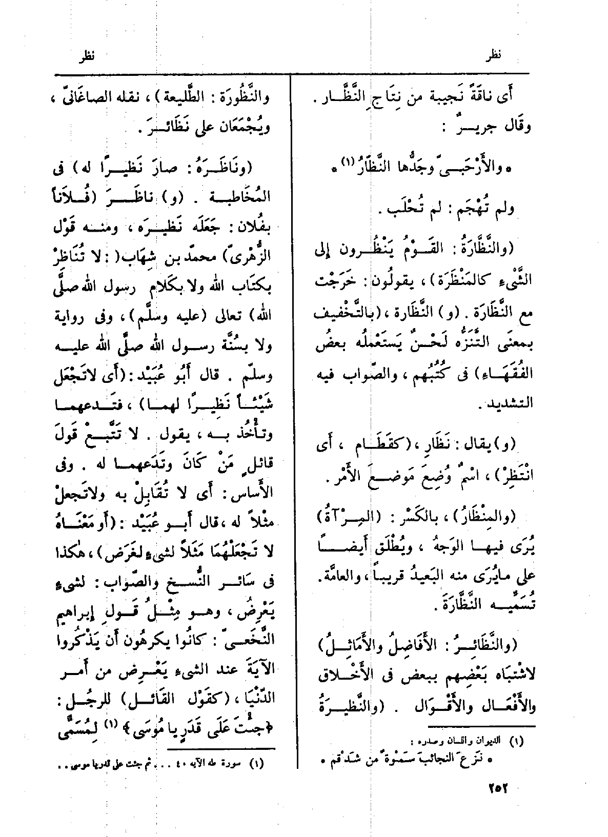 والنَّظيرَة والنَّظُورة: الطَّليعة، نَقله الصَّاغانِيّ، ويُجمَعان على نَظائِر. وناظَرَهُ: صارَ نَظيراً لَهُ فِي المُخاطَبة. ناظَرَ فلَانا بفلان: جَعَلَه نَظيرَه، وَمِنْه قَوْل الزُهْرِيّ مُحَمَّد بن شهَاب: لَا تُناظِرْ بِكِتَاب الله وَلَا بِكَلَام رَسُول الله صلّى الله تَعَالَى عَلَيْهِ وسلَّم، وَفِي رِوَايَة وَلَا بسُنَّةِ رَسُول الله صلّى الله عَلَيْهِ وسلَّم. قَالَ أَبُو عُبَيْد: أَي لَا تَجْعَل شَيْئا نَظيراً لَهما، فَتَدعْهما وَتَأْخُذ بِهِ، يَقُول: لَا تَتَّبِع قَوْلَ قائلٍ مَن كَانَ وَتَدَعهما لَهُ. وَفِي الأساس: أَي لَا تُقابِل بِهِ وَلَا تجعلْ مثْلاً لَهُ، قَالَ أَبُو عُبَيْد: أَو مَعْنَاهُ لَا تَجْعَلهما مَثَلاً لشيءٍ لغَرَض، هَكَذَا فِي سَائِر النّسخ وَالصَّوَاب: لشيْءٍ يَعْرِض، وَهُوَ مِثلُ قَوْلِ إِبْرَاهِيم النَّخَعيّ: كَانُوا يكْرهُونَ أَن يذكرُوا الآيةَ عِنْد الشَّيْء يَعْرِض من أَمر الدُّنْيَا، كَقَوْل الْقَائِل للرجل: جِئتَ على قَدَرٍ يَا مُوسَى لمُسَمّىً
