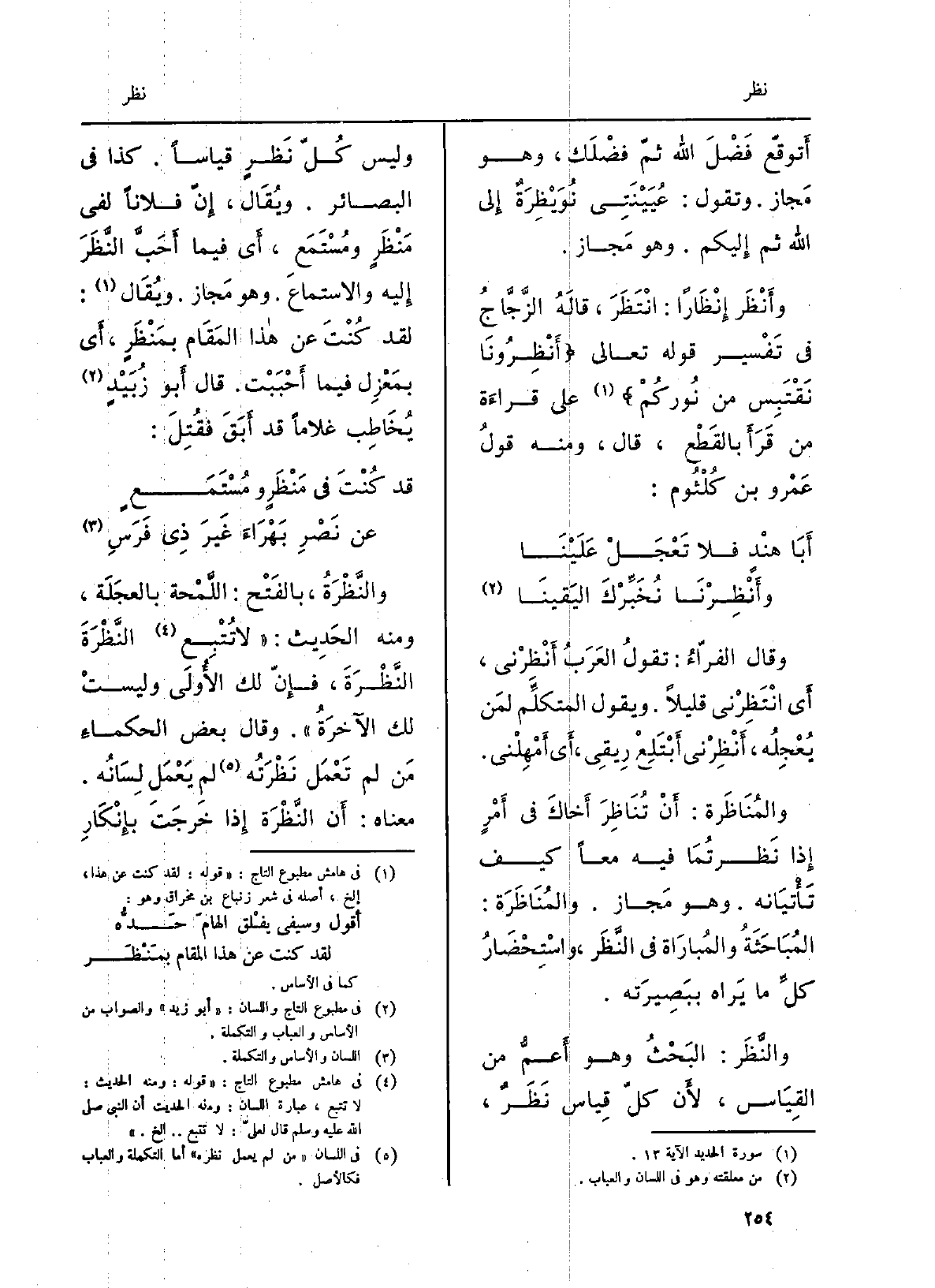 والمُناظَرَة: أَن تُناظِرَ أخاكَ فِي أمرٍ إِذا نظرتما فِيهِ مَعًا كَيفَ تَأْتِيانِه. وَهُوَ مجَاز. والمُناظَرَة: المُباحَثةُ والمُباراة فِي النَّظَر، واستِحْضارُ كلِّ مَا يرَاهُ ببَصيرتِه. والنَّظَر: البحثُ وَهُوَ أعمُّ من الْقيَاس، لِأَن كلّ قِيَاس نَظَرٌ، وَلَيْسَ كلّ نَظَرٍ قِيَاس. كَذَا فِي البصائر. وَيُقَال: إنّ فلَانا لفي مَنْظَرٍ ومُستَمَع، أَي فِيمَا أحَبَّ النَّظَرَ إِلَيْهِ والاستِماع. وَهُوَ مجَاز.