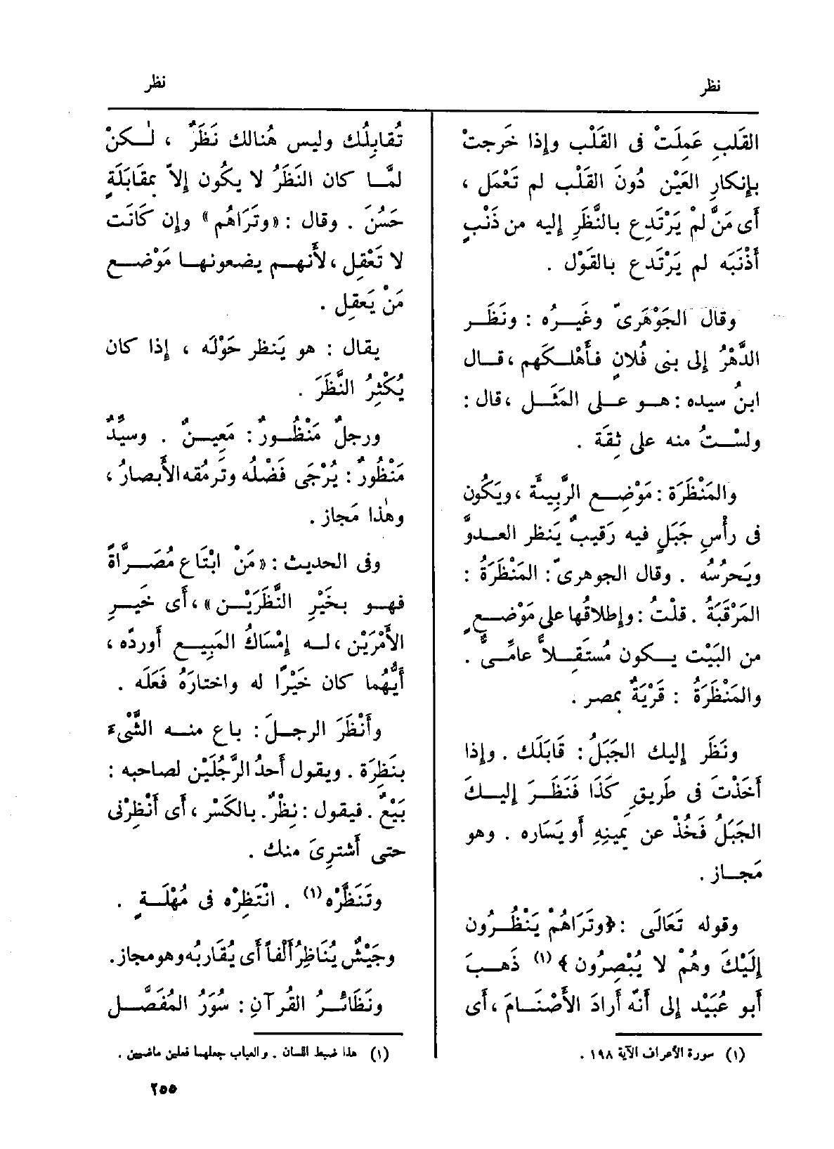 والمَنْظَرَة: مَوْضِعُ الرَّبِيئة، وَيكون فِي رأسِ جبلٍ فِيهِ رَقيبٌ يَنْظُر العدوَّ ويحرُسُه. وَقَالَ الجَوْهَرِيّ: المَنْظَرَة: المَرْقَبَة. قلتُ: وإطلاقُها على مَوْضِعٍ من الْبَيْت يكون مُستَقِلاًّ عامِّيٌّ. والمَنْظَرَة: قريةٌ بِمصْر. وَنَظَرَ إِلَيْك الجبلُ: قابَلَك. وَإِذا أخذْتَ فِي طريقِ كَذَا فَنَظَر إليكَ الجبلُ فخُذْ عَن يَمِينه أَو يسَاره. وَهُوَ مجَاز. وقَوْلُهُ تَعالى: وتَراهُم يَنْظُرونَ إليكَ وهم لَا يُبصِرون ذهبَ أَبُو عُبَيْد إِلَى أنّه أَرَادَ الأصنامَ، أَي تُقابلُك وَلَيْسَ هنالِك نَظَرٌ، لكنْ لمّا كَانَ النَّظَرُ لَا يكون إِلَّا بمقابلةٍ حِسُنَ. وَقَالَ: وَتَرَاهُم وَإِن كَانَت لَا تَعْقِل، لأَنهم يضعونها مَوْضِع من يَعْقِل. يُقَال: هُوَ يَنْظُر حَوْلَه، إِذا كَانَ يُكثِر النَّظَر. ورجلٌ مَنْظُورٌ: مَعِينٌ. وسيِّدٌ مَنْظُورٌ: يُرجى فَضْلُه وترمُقُه الْأَبْصَار، وَهَذَا مجَاز. وَفِي الحَدِيث: مَن ابْتاعَ مُصَرَّاةً فَهُوَ بخَيْرِ النَّظَرَيْنِ، أَي خَيْرِ الأمْرَيْن، لَهُ إمْساكُ المَبيع أَو ردّه، أيُّهما كَانَ خيرا لَهُ وَاخْتَارَهُ فَعَلَه. وأَنْظَرَ الرجلُ: بَاعَ مِنْهُ الشيءَ بنَظِرَة. وَيَقُول أحدُ الرجُلَيْن لصَاحبه: بَيْعٌ. فَيَقُول: نِظْرٌ.