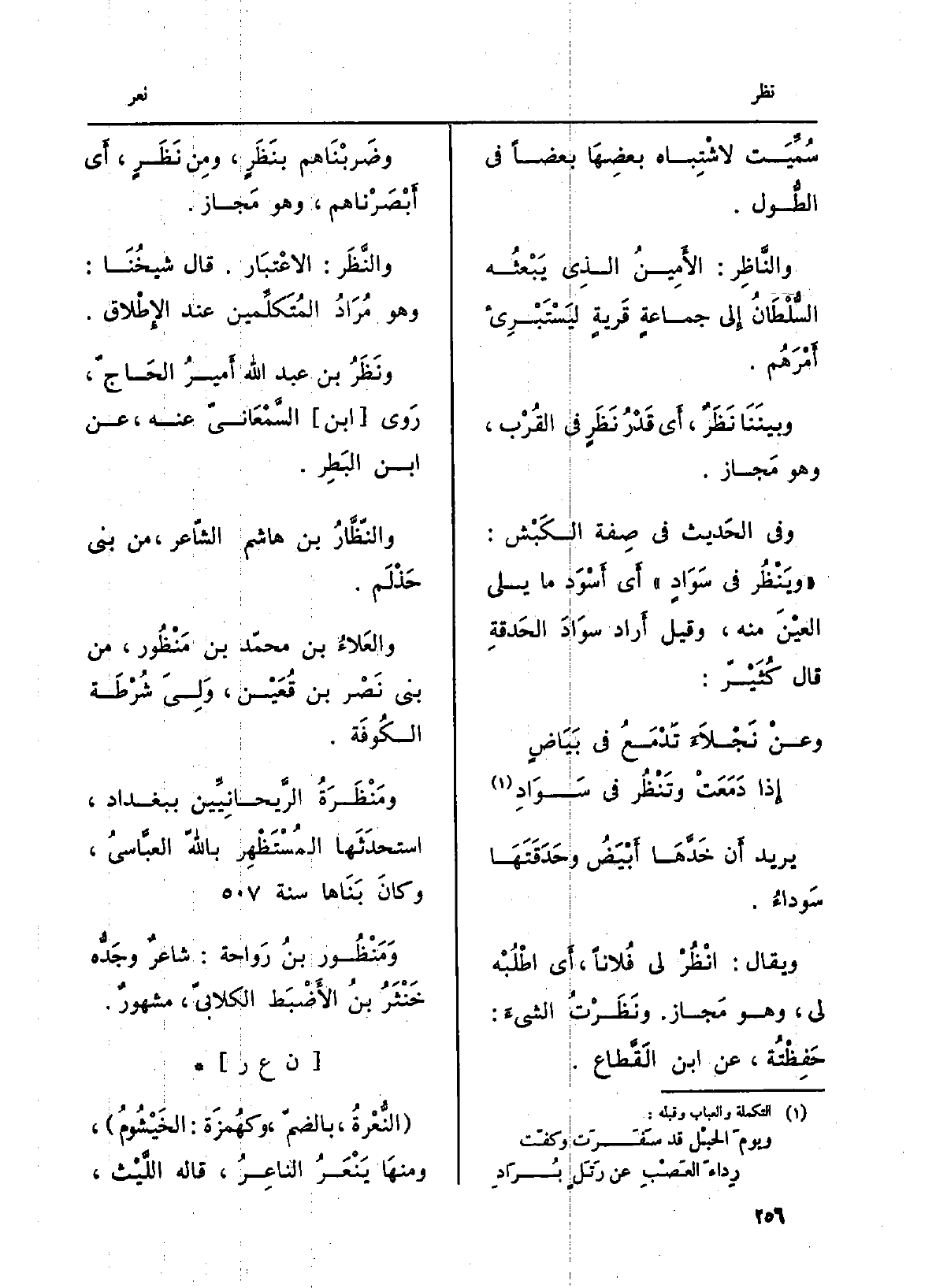 يُرِيد أَن خَدَّها أَبْيَضُ وَحَدَقتها سَوداء. وَيُقَال: انْظُرْ لي فلَانا، أَي اطْلُبْه لي، وَهُوَ مجَاز. وَنَظَرْتُ الشيءَ: حَفِظْتُه، عَن ابْن القَطَّاع. وضَربْناهم بنَظَرٍ، ومِن نَظَرٍ: أَي أَبْصَرْناهم، وَهُوَ مجَاز. والنَّظَر: الاعتِبار. قَالَ شَيْخُنا: وَهُوَ مُرادُ المُتكلِّمين عِنْد الإطْلاق. وَنَظَرُ بن عبد الله أميرُ الحاجّ، روى ابْن السَّمْعانيّ عَنهُ، عَن ابنِ البَطِر. والنَّظَّارُ بن هَاشم الشَّاعِر، من بني حَذْلَم. والعلاءُ بن مُحَمَّد بن مَنْظُور، من بني نَصْر بن قُعَيْن، وَلِيَ شُرْطَة الكُوفة. وَمَنْظَرَةُ الرَّياحنيِّين بِبَغْدَاد، استَحْدَثها المُستَظْهِر بِاللَّه العبّاسيُّ، وَكَانَ بناها سنة. ومَنْظُور بن رَواحة: شاعرٌ وجدُّه خَنْثَرُ بنُ الأَضْبَط الكلابيّ، مَشْهُور.