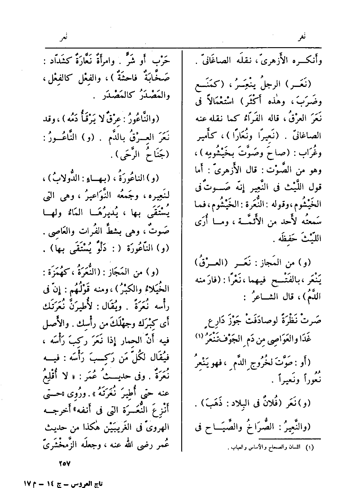 أَو: صَوَّت لخُرُوج الدمِ، فَهُوَ يَنْعِرُ نُعوراً ونَعيراً. نَعَرَ فلانٌ فِي الْبِلَاد: ذَهَبَ. والنَّعِيرُ: الصُّراخ والصِّياح فِي حَرْب أَو شرٍّ. وامرأةٌ نَعَّارةٌ كشَدّاد: صَخَّابةٌ فاحشةٌ، والفِعلُ كالفِعل، والمَصدرُ كالمَصدرِ. والنَّاعور: عِرْقٌ لَا يَرْقَأُ دَمُه، وَقد نَعَرَ العِرقُ بالدّم. النَّاعور: جَناحُ الرَّحى. النَّاعورة، بهاءٍ: الدُّولاب، لنَعيرِه، وجمعُه النَّواعير، وَهِي الَّتِي يُسْتَقى بهَا، يُديرُها الماءُ وَلها صوتٌ، وَهِي بشطِّ الْفُرَات والعاصي. النَّاعورة: دَلْوٌ يُستَقى بهَا. وَمن الْمجَاز عَلَيْهِ: النُّعَرَة، كهُمَزَة: الخُيَلاءُ والكبْرُ، وَمِنْه قَوْلُهم: إنّ فِي رَأْسِه نُعَرَةً. وَيُقَال: لأُطَيرَنَّ نُعَرَتَك أَي كِبْرَك وجهلَكَ من رَأْسِك. وَالْأَصْل فِيهِ أنّ الْحمار إِذا نَعَرَ رَكِبَ رَأْسَه، فَيُقَال لكلِّ من رَكِبَ رَأْسَه: فِيهِ نُعَرَةٌ. وَفِي حَدِيث عمر: لَا أٌ قلِعُ عَنهُ حَتَّى أُطِيرَ نُعَرَتَه. . ورُوي: حَتَّى أَنْزِعَ النُّعَرَةَ الَّتِي فِي أَنْفِه أخرجه الهرويّ فِي الغريبَيْن هَكَذَا من حَدِيث عمر رَضِي الله عَنهُ، وَجعله الزَّمَخْشَرِيّ