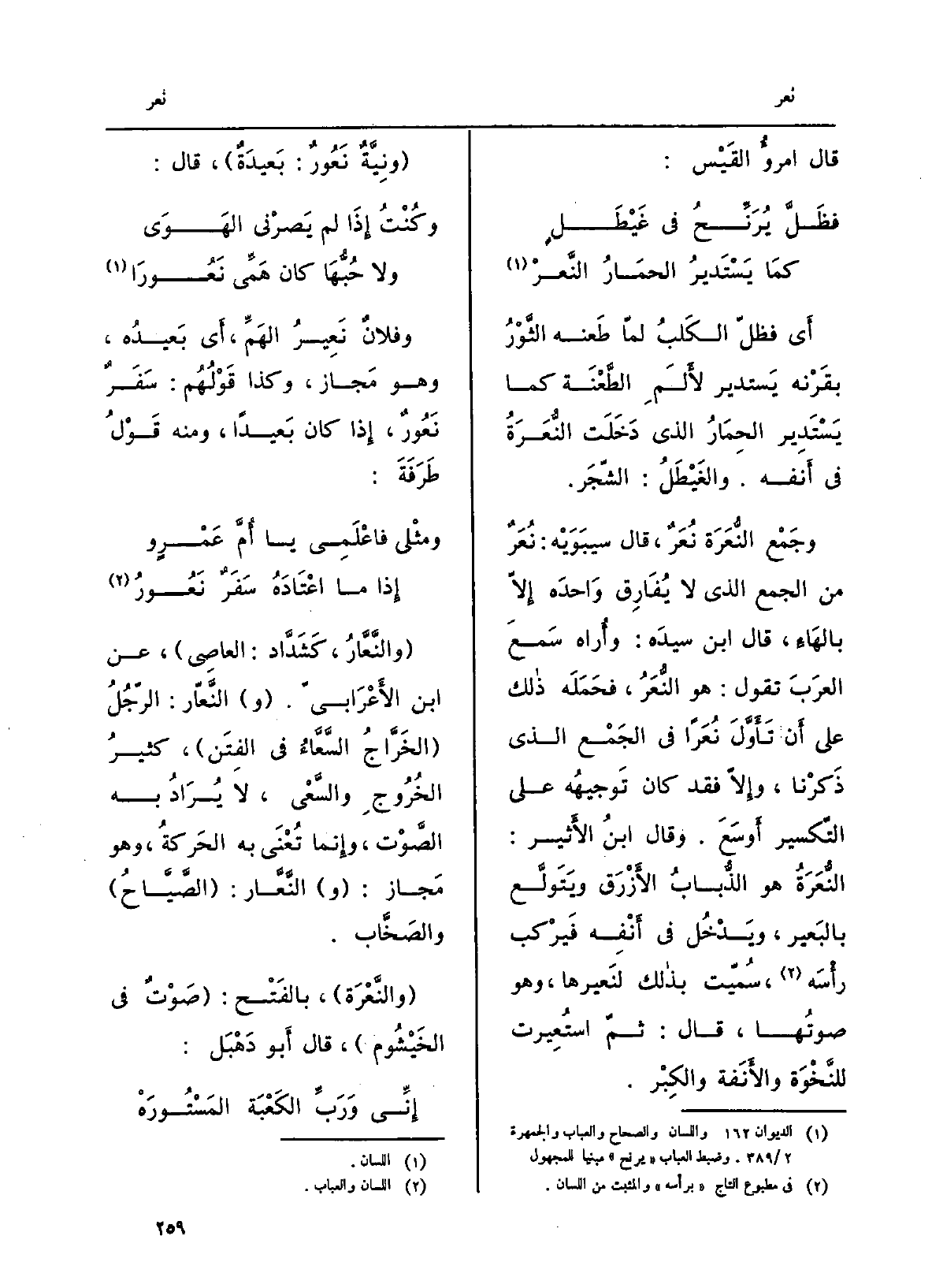 أَي فظلَّ الكلبُ لمّا طعنه الثورُ بقَرْنه يَستدير لألَمِ الطعنةِ كَمَا يَستديرُ الحمارُ الَّذِي دَخَلَتْ النُّعَرَةُ فِي أَنفه. والغَيْطَلُ: الشّجَر. وَجمع النُّعَرَة نُعَرٌ، قَالَ سِيبَوَيْهٍ: نُعَرٌ من الْجمع الَّذِي لَا يُفارق واحده إلاّ بالهاءِ، قَالَ ابنُ سِيدَه: وأُراه سَمِعَ العربَ تَقول: هُوَ النُّعَرُ، فَحَمَله على ذَلِك على أَن تأَوَّلَ نُعَرَاً فِي الْجمع الَّذِي ذَكَرْنا، وإلاّ فقد كَانَ توجيهُه على التكسير أَوْسَع. وَقَالَ ابنُ الْأَثِير: النُّعَرَةُ هُوَ الذُّبابُ الْأَزْرَق وَيَتَولَّع بالبعير، ويدخلُ فِي أَنْفِه فيركب رَأْسَه، سُمّيت بذلك لنَعيرها، وَهُوَ صوتُها، قَالَ: ثمّ استُعيرت للنَّخْوَة والأَنَفة والكِبْر. ونِيَّةٌ نَعورٌ: بَعيدةٌ، قَالَ: