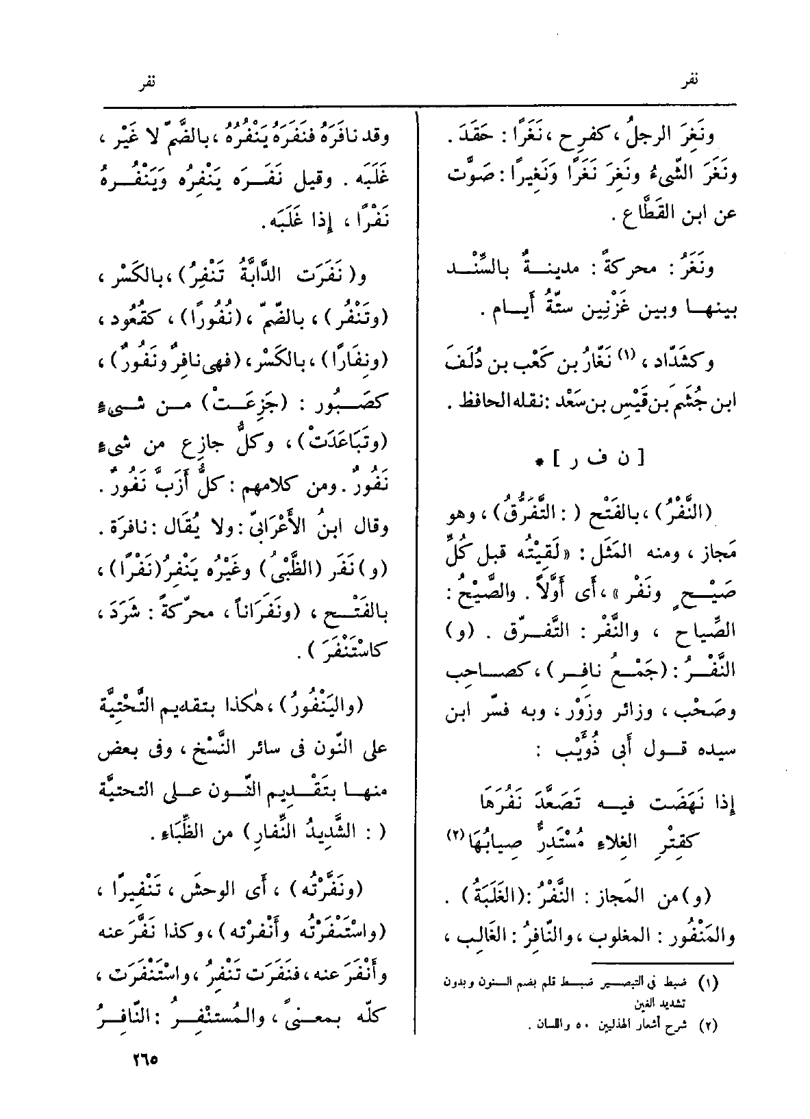منَ المَجاز: النَّفْرُ: الغَلَبَة. والمَنْفُور: المغلوب، والنّافِرُ: الغالِب، وَقد نافَرَه فَنَفَرهُ يَنْفُرهُ، بالضّمّ لَا غَيْر، غَلَبَه. وَقيل نَفَرَه يَنْفِرهُ ويَنْفُرهُ نَفْرَاً، إِذا غَلَبَه. وَنَفَرت الدّابّةُ تَنْفِرُ، بِالْكَسْرِ، وتَنْفُر، بالضمّ، نُفوراً، كقُعود، ونِفاراً، بِالْكَسْرِ، فَهِيَ نافِرٌ ونَفُورٌ، كصَبور: جَزِعَتْ من شَيْء وتَباعَدَتْ، وكلُّ جازِع من شيءٍ نَفُورٌ. وَمن كَلَامهم: كلُّ أزَبَّ نَفُورٌ. وَقَالَ ابْن الأَعْرابِيّ: وَلَا يُقَال: نافرَة. نَفَرَ الظَّبْيُ وغيرُه يَنْفِرُ نَفْرَاً، بِالْفَتْح، وَنَفَراناً، محرّكةً: شَرَدَ، كاسْتَنْفَر. واليَنْفُور، هَكَذَا بِتَقْدِيم التَّحْتيّة على النُّون فِي سَائِر النّسخ، وَفِي بعض مِنْهَا بِتَقْدِيم النّون على التّحْتيّة: الشَّديدُ النِّفارِ من الظِّباء. ونَفَّرْتُه، أَي الوحشَ، تَنْفِيراً، واستْتَنْفَرْتُه وأَنْفَرته، وَكَذَا نَفَّرَ عَنهُ وأَنْفَرَ عَنهُ، فَنَفَرتْ تَنْفِرُ، واسْتَنْفَرَتْ، كُله بِمَعْنى، والمُسْتَنْفِر: النّافِرُ