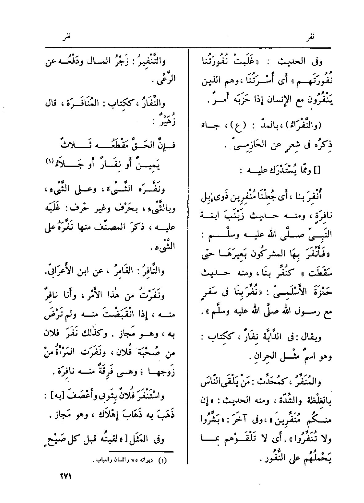 وَفِي الحَدِيث: غَلَبَتْ نُفورَتُنا نُفورَتُهم أَي أُسرَتُنا، وهم الَّذين يَنْفُرون مَعَ الْإِنْسَان إِذا حَزَبَه أمرٌ. والنَّفْراء، بالمدّ: ع، جاءَ ذِكرُه فِي شِعرٍ عَن الحازميّ. ومِمّا يُسْتَدْرَك عَلَيْهِ: أُنفِرَ بِنَا، أَي جُعِلنا مُنفِرين ذَوي إبل نافِرَةٍ، وَمِنْه حَدِيث زَيْنَب ابْنة النبيِّ صلّى الله عَلَيْهِ وسلَّم: فَأَنْفَرَ بهَا الْمُشْركُونَ بَعيرَها حَتَّى سَقَطَتْ كنُفِّر بِنَا، وَمِنْه حَدِيث حَمْزَةَ الأسْلَميّ: نُفِّرَ بِنَا فِي سفرٍ مَعَ رَسُول الله صلّى الله عَلَيْهِ وسلَّم. وَيُقَال: فِي الدَّابَّةِ نِفارٌ، ككِتاب: وَهُوَ اسمٌ مثل الحِران. والمُنَفِّر، كمُحَدِّث: مَن يلقى الناسَ بالغِلْظَةِ والشِّدَّةِ، وَمِنْه الحَدِيث: إِن مِنْكُم مُنَفِّرين، وَفِي آخر: بَشِّروا وَلَا تُنَفِّروا. أَي لَا تَلْقَوْهم بِمَا يَحْمِلهم على النُّفور. والتَّنْفيرُ: زَجْرُ المَال وَدَفْعُه عَن الرَّعْي. والنِّفَار، ككِتاب: المُنافَرَة، قَالَ زُهَيْرٌ: