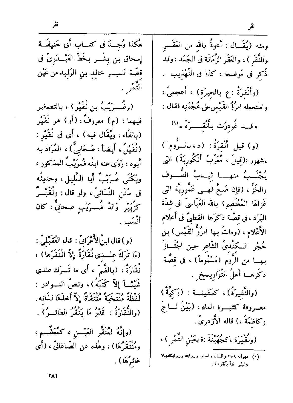وَمِنْه يُقَال: أَعوذُ بِاللَّه من العَقَرِ والنَّقَرِ، والعَقَر الزّمانَة فِي الجَسَد، وَقد ذُكِر فِي مَوْضِعه، كَذَا فِي التَّهْذِيب. وأَنْقِرَةُ: ع بالحيرَةِ، أَعجميّ، وَاسْتَعْملهُ امْرُؤ الْقَيْس على عُجْمَته فَقَالَ: قد غُودِرَتْ بِأَنْقِرَهْ قيل أَنْقِرةُ: د بالرُّوم مَشْهُور، قيلَ: مُعَرَّبُ أَنكُورِيَةَ الَّتِي يُجلَبُ مِنْهَا ثيابُ الصّوف والخَزِّ، فَإِن صحَّ فَهِيَ عَمُّورِية الَّتِي غَزاها المعتصم بِاللَّه العبّاسيّ فِي شدَّة الْبرد، فِي قصَّة ذكرهَا القطبيّ فِي أَعلام الأَعلام، وَمَات بهَا امْرُؤ الْقَيْس بن حُجْر الكِنديّ الشّاعر حِين اجتاز بهَا من الرُّوم مَسْموماً، فِي قصَّة ذكرهَا أَهل التواريخ. والنَّقيرةُ، كسفينة: رَكِيَّةٌ مَعروفةٌ كَثِيرَة الماءِ، بينَ ثاجَ وكاظِمَةَ، قَالَه الأَزْهَرِيّ. ونُقَيْرَة، كجُهَيْنَةَ: ة بعَيْنِ التَّمْرِ، هَكَذَا وُجد فِي كتاب أَبي حنيفَة إِسْحَاق بن بِشْر بخَطِّ العَبْدَريّ فِي قصَّة مسير خَالِد بن الْوَلِيد من عَين التَّمْرِ. وضُرَيْبُ بنُ نُقَيْر، بِالتَّصْغِيرِ فيهمَا، م معروفٌ، أَو هُوَ نُفَيْر بِالْفَاءِ، وَيُقَال فِيهِ، أَي فِي نُقَيْرِ: نُقَيْلٌ، أَيضاً صحابيٌّ، المُراد بِهِ أَبوه، رَوى عَنهُ ابنُه ضُرَيْبٌ المَذكور، ويُكْنَى ضُرَيْبٌ أَبَا السَّليل، وَحَدِيثه فِي سنَن النِّسائيّ، وَلَو قَالَ: ونُقَيْرٌ كزُبَيْر والِدُ ضُرَيْبٍ صحابيٌّ، كَانَ أَنْسَب. قَالَ ابْن الأَعرابيّ: قَالَ العُقَيليّ: مَا ترك عِنْدِي نُقارَةً إلاّ انْتَقَرَها، نُقارَةٌ، بالضَّمّ، أَي)