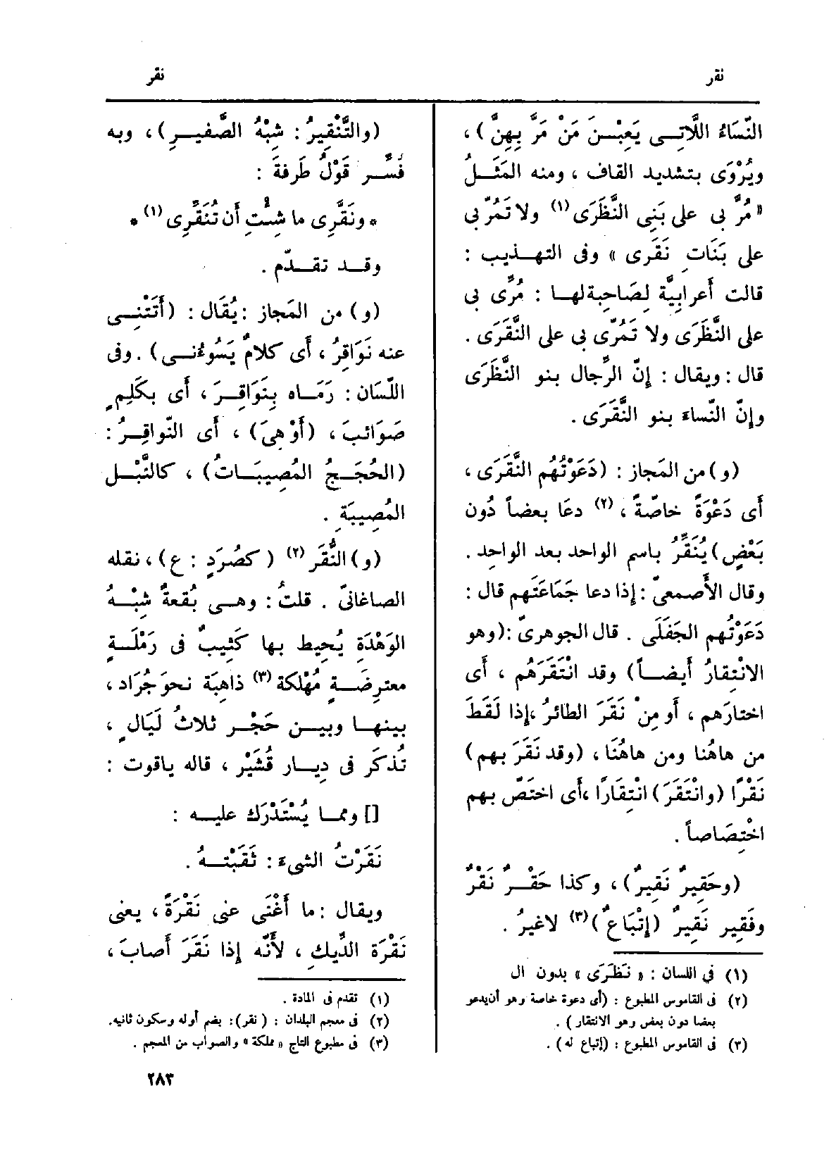 النِّساءُ اللاّتِي يَعِبْنَ مَنْ مَرَّ بهنَّ، ويُروَى بتَشْديد الْقَاف، وَمِنْه المَثَلُ: مُرَّ بِي على بني النَّظَرَى وَلَا تَمُرَّ بِي على بَنَات نَّقَرَى، وَفِي التَّهْذِيب: قَالَت أعرابيةٌ لصاحبةٍ لَهَا: مُرِّي بِي على النَّظَرَى وَلَا تَمُرِّي بِي على النَّقَرَى. قَالَ: وَيُقَال: إنَّ الرِّجالَ بَنو النَّظَرَى وإنَّ النِّساءَ بَنو النَّقَرَى. منَ المَجاز: دَعَوْتُهُم النَّقَرَى، أَي دَعْوَة خاصَّةً، دَعَا بَعْضًا دون بعضٍ يُنَقِّرُ باسم الْوَاحِد بعد الْوَاحِد. وَقَالَ الأَصمعيّ: إِذا دَعَا جماعتَهم قَالَ: دَعَوْتُهم الجَفَلَى. قَالَ الجَوْهَرِيّ: وَهُوَ الانْتِقارُ أَيضاً وَقد انْتَقَرَهم، أَي اختارَهم، أَو مِن نَقَرَ الطَّائِر، إِذا لَقَطَ من هَا هُنَا وَمن هَا هُنا، وَقد نَقَرَ بهم نَقْراً وانْتَقَرَ انْتِقاراً، أّي اختصَّ بهم اخْتِصاصاً. وحقيرٌ نَقيرٌ، وَكَذَا حَقْرٌ نَقْرٌ وفقيرٌ نَقيرٌ إتْباعٌ لَا غير. والتَّنْقيرُ: شِبْه الصَّفير، وَبِه فُسِّر قَول طَرَفَة: وَنَقّري مَا شئتِ أَنْ تُنَقِّري وَقد تقدّم. منَ المَجاز: يقالُ: أَتَتْني عَنهُ نَواقِرُ، أَي كلامٌ يسوءُني. وَفِي اللِّسَان: رَماهُ بِنَواقِرَ، أَي بكَلِمٍ صَوائِبَ، أَو هِيَ، أَي النَّواقِرُ: الحُجَجَ المُصيباتُ، كالنَّبْلِ المُصيبَةِ. النُّقَرُ كَصُرَدٍ: ع، نَقله الصَّاغانِيّ. قلتُ: وَهِي بقعةٌ شبه الوَهْدَةِ يُحِيط بهَا كَثيبٌ فِي رَمْلَةٍ مُعترِضَةٍ مُهلكةٍ ذاهبَةٍ نحوَ جُراد، بَينهَا وَبَين حَجْر ثلاثُ ليالٍ، تُذْكَرُ فِي ديار) قُشَيْر، قَالَه ياقوت. وَمِمَّا يسْتَدرك عَلَيْهِ: نَقَرْتُ الشَّيْءَ: ثَقَبْتُه. وَيُقَال: مَا أَغنى عَنِّي نَقْرَةً، يَعْنِي نَقْرَةَ الدِّيكِ، لأَنَّه إِذا نَقَرَ أَصابَ،