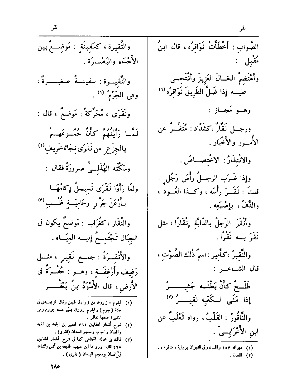 والنَّاقور: القلبُ، رَوَاهُ ثَعلبٌ عَن ابْن الأَعرابيّ. والنَّقيرةُ، كسفينةٍ: مَوضِعٌ بَين الأَحساءِ والبَصْرَة. والنَّقيرة: سفينةٌ صغيرةٌ، وَهِي الجَرْمُ. ونَقَرَى، مُحَرَّكَةً: مَوضِعٌ، قَالَ: