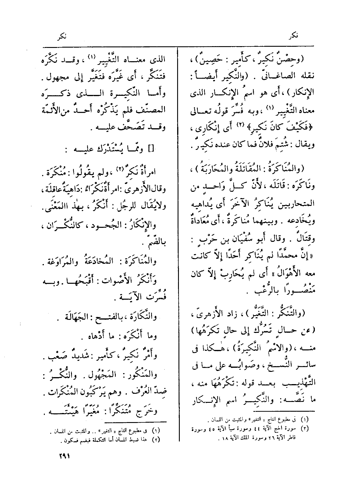 وحِصنٌ نَكيرٌ، كأَمير: حَصين، نَقله الصَّاغانِيّ. والنَّكير أَيْضا: الْإِنْكَار، أَي هُوَ اسمُ الْإِنْكَار الَّذِي مَعْنَاهُ التَّغيير، وَبِه فُسِّر قَوْلُهُ تَعالى: فكيفَ كَانَ نَكير أَي إنْكاري، وَيُقَال: شُتِم فلانٌ فَمَا كَانَ عِنْده نَكيرٌ. والمُناكَرَة: المُقاتَلة والمُحارَبة، وناكَرَه: قاتَله، لأنّ كلَّ واحدٍ من المتحاربين يُناكِرُ الآخرَ أَي يُداهيه ويُخادعه. وَبَينهمَا مُناكرةٌ، أَي مُعاداةٌ وقتال. وَقَالَ أَبُو سُفْيَان بن حربٍ: إنَّ مُحَمَّدًا لم يُناكِرْ أحدا إلاّ كَانَت مَعَه الْأَهْوَال. أَي لم يحارِب إلاّ كَانَ مَنْصُوراً بالرُّعب. والتَّنَكُّر: التَّغَيُّر، زَاد الأَزْهَرِيّ: عَن حالٍ تَسُرُّك إِلَى حالٍ تكرهها مِنْهُ، والاسمُ النَّكيرَة، هَكَذَا فِي سَائِر النخ، وصوابُه على مَا فِي التَّهْذِيب بعد قَوْله: تَكْرَهُها مِنْهُ، مَا نصُّه: والنَّكيرُ اسْم الْإِنْكَار الَّذِي مَعْنَاهُ التَّغيير، وَقد نَكَّرَه فَتَنَكَّر، أَي غيَّره فَتَغَيَّر إِلَى مَجْهُول. وَأما النَّكيرة الَّذِي ذكره المصنّف فَلم يَذْكُره أحدٌ من الْأَئِمَّة وَقد تصَحَّف عَلَيْهِ. ومِمّا يُسْتَدْرَك عَلَيْهِ: امرأةٌ نَكِرٌ، وَلم يَقُولُوا: مُنْكَرَة. وَقَالَ الأَزْهَرِيّ: امرأةٌ نَكْرَاءٌ: داهِيَةٌ عاقِلَة، وَلَا يُقَال للرجل: أَنْكَر، بِهَذَا الْمَعْنى. والإنْكار: الجُحود، كالنُّكْران، بالضمّ. والمُناكَرة: المُخادعة والمُراوَغة. وأَنْكَر الْأَصْوَات: أَقْبَحها. وَبِه فُسِّرت الْآيَة. والنَّكارَة، بِالْفَتْح: الجَهالَة. وَمَا أَنْكَره: مَا أَدْهَاه. وأمرٌ نَكيرٌ، كأَمير: شديدٌ صَعْب. والمَنْكور: المَجهول. والنُّكْر: ضِدّ العُرْف. وهم يَرْكَبون المُنْكَرات. وخرجَ مُتَنَكِّراً: مُغيِّراً هَيْئَته.