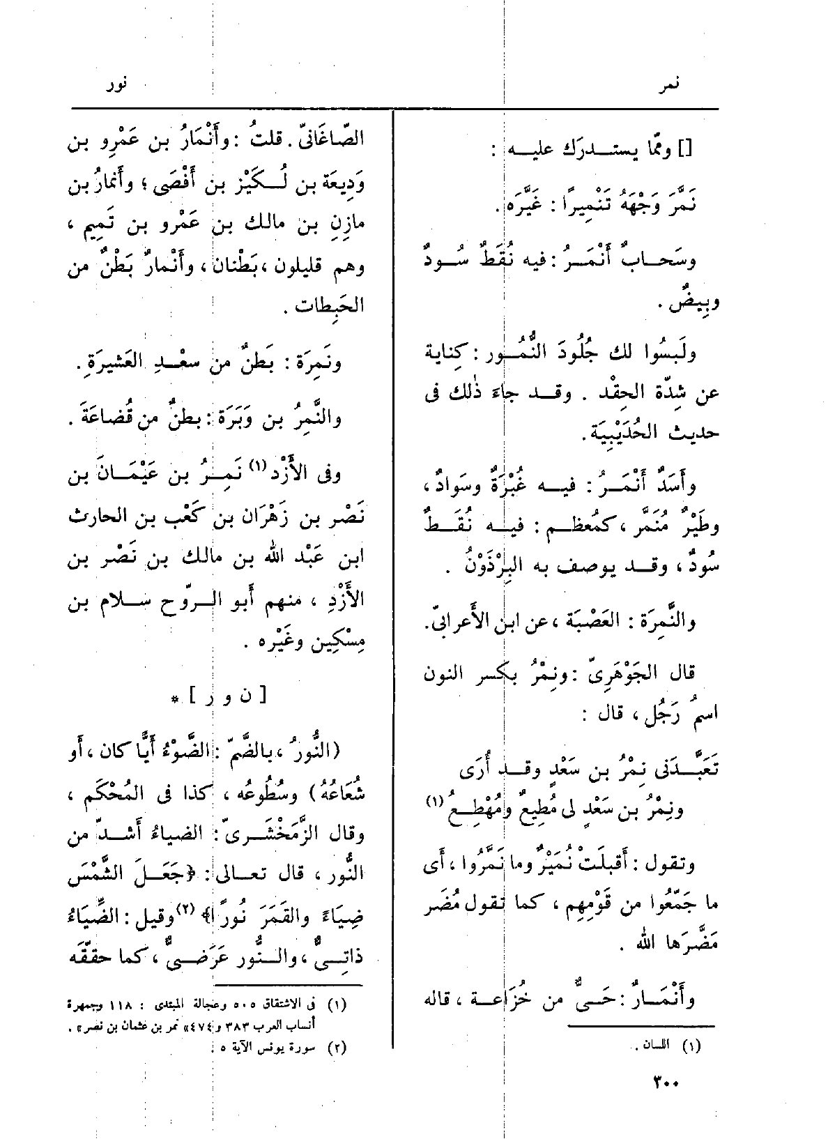 وَتقول: أقبلَتْ نُمَيْرٌ وَمَا نَمَّروا، أَي مَا جمَّعوا من قَوْمِهم، كَمَا تَقول مُضَر مَضَّرَها الله. وأَنْمَارٌ: حَيٌّ من خُزاعة، قَالَه الصَّاغانِيّ. قلتُ: وأَنْمَارُ بن عَمْرُوِ بن وديعةَ بن لُكَيْز بن أَفْصَى وأَنْمَارُ بن مازنِ بن مَالك بن عَمْرو بن) تَميم، وهم قَلِيلُونَ، بَطْنَان، وأَنْمَارٌ بطنٌ من الحَبِطات. ونَمِرَة: بطنٌ من سَعْدِ العَشيرة. والنَّمِرُ بن وَبَرَةَ: بطنٌ من قُضاعة. وَفِي الأَزْدِ نَمِرُ بن عَيْمَان بن نَصْر بن زَهْرَان بن كَعْب بن الْحَارِث بن عَبْد الله بن مَالك بن نَصْر بن الأَزْد، مِنْهُم أَبُو الرّوح سَلام بن مِسْكين وَغَيره.