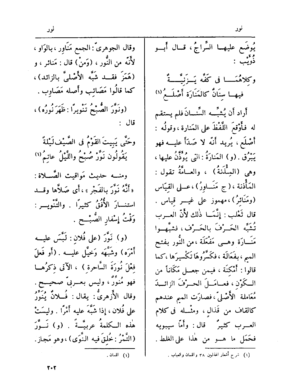 المَنارةُ: الَّتِي يُؤَذَّن عَلَيْهَا، وَهِي المِئْذَنةُ، والعامَّةُ تَقول: المَأْذَنَة، ج {مَناوِر، على الْقيَاس ومَنائر، مَهْمُوز على غير قِيَاس. قَالَ ثَعْلَب: إنّما ذَلِك لأنّ الْعَرَب تُشبِّه الحرفَ بالحرف، فشبَّهوا مَنارة وَهِي مَفْعَلة، من النُّور بِفَتْح الْمِيم، بفَعَالة، فكَسَّروها تَكْسِيراً، كَمَا قَالُوا: أَمْكِنة، فِيمَن جعلَ مَكاناً من الكَوْن، فعامَلَ الحرفَ الزائدَ مُعاملةَ الأصليّ، فَصَارَت الْمِيم عِنْدهم كالقاف من قَذالٍ، وَمثله فِي كَلَام الْعَرَب كثيرٌ. قَالَ: وأمّا سِيبَوَيْهٍ فَحَمَل مَا هُوَ من هَذَا على الْغَلَط. وَقَالَ الجَوْهَرِيّ: الْجمع} مَناوِر، بِالْوَاو، لأنّه من النُّور، وَمَنْ قَالَ: مَنائر، وَهَمَزَ فقد شبَّه الأصليَّ بِالزَّائِدِ، كَمَا قَالُوا مَصائب وَأَصله مَصاوِب. {ونَوَّرَ الصُّبحُ} تَنْوِيراً: ظَهَرَ نُورُه، قَالَ: