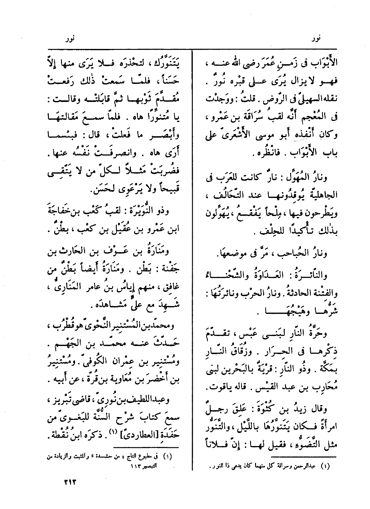 {ونارُ المُهَوِّل: نارٌ كَانَت للْعَرَب فِي الجاهليّة يُوقِدونها عِنْد التحالُف، ويَطرحون فِيهَا مِلْحاً يَفْقَعُ، يُهَوِّلون بذلك تَأْكِيدًا للحِلْف. ونارُ الحُباحب: مرَّ فِي موضعهَا.} والنّائرةُ: العداوةُ والشَّحْناءُ والفِتنة الْحَادِثَة. ونارُ الحربِ {ونائِرَتُها: شَرُّها وهَيْجُها. وحَرَّةُ النارِ لبني عَبْس، تقدّم ذِكرها فِي الحِرار. وزُقاقُ النارِ بمكَّة. وَذُو النّارِ: قريةٌ بالبحرَيْن لبني مُحارِب بن عبد الْقَيْس. قَالَه ياقوت. وَقَالَ زيدُ بن كُثْوَة: عَلِقَ رجلٌ امْرَأَة فَكَانَ} يَتَنَوَّرُها بِاللَّيْلِ، {والتَّنَوُّر مثل التَّضوُّء، فَقيل لَهَا: إنّ فلَانا} يَتَنَوَّرُكِ، لتَحذرْه فَلَا يرى مِنْهَا إلاّ حَسَنَاً، فَلَمَّا سمعتْ ذَلِك رفعتْ مُقدَّمَ ثوبِها ثمّ قابلَتْه وَقَالَت: يَا {مُتَنَوِّراً هاه. فلمّا سَمِعَ مَقالتَها وَأبْصر مَا فعلتْ، قَالَ: فبئسما أرى هاه. وانصرفتْ نَفْسُه عَنْهَا. فضُربَت مَثلاً لكلّ من لَا يتَّقي قبيحاً وَلَا يَرْعَوي لحسَن. وَذُو النُّوَيْرَة: لقبُ كَعْب بن خَفاجة بن عَمْرو بن عُقَيْل بن كعْب، بطنٌ. ومَنارَةُ بن عَوْف بن الْحَارِث بن جَفْنَة: بَطْن. ومَنارةُ أَيْضا بَطْنٌ من غافِق، مِنْهُم إياسُ بنُ عَامر} - المَناريُّ، شَهِدَ مَعَ عليٍّ مَشاهدَه. وَمُحَمّد بن {المُستَنير النَّحْويّ هُوَ قُطْرُب، حدَّث عَنهُ مُحَمَّد بن الجَهْم. ومُستَنير بن عِمْران الكوفيّ.} ومُستَنيرُ بن أَخْضَر بن مُعَاوِيَة بن قُرّة، عَن أَبِيه. وَعبد اللَّطِيف بن نُوريّ، قَاضِي تَبْريز، سمعَ كتابَ شرْح السُّنَّة للبَغويّ من حَفَدَةِ العطارديّ. ذكره ابنُ نُقْطة.