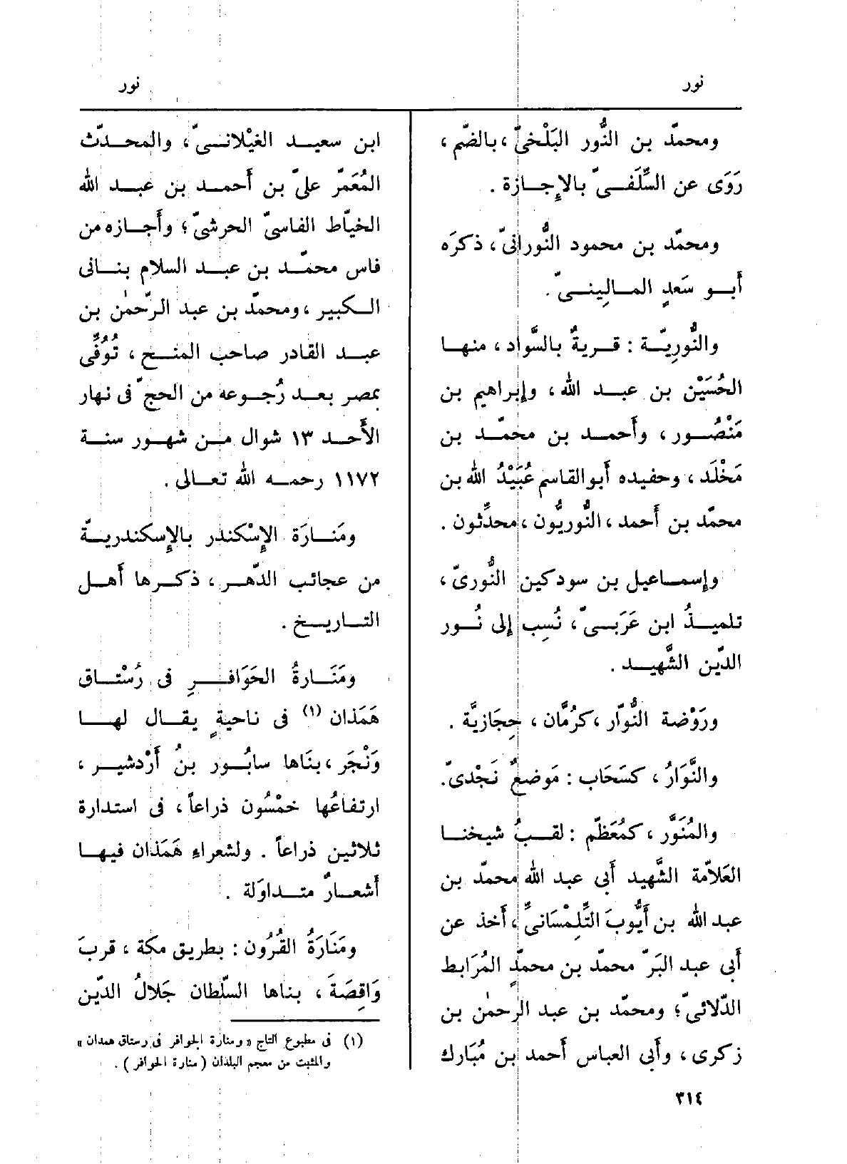 وَمُحَمّد بن {النُّور البَلْخيّ، بالضمّ، روى عَن السِّلَفيّ بِالْإِجَازَةِ. وَمُحَمّد بن مَحْمُود} النُّورانيّ، ذكره أَبُو سعدٍ المالينيّ. {والنُّوريَّة: قريةٌ بالسَّواد، مِنْهَا الْحُسَيْن بن عَبْد الله، وَإِبْرَاهِيم بن مَنْصُور، وَأحمد بن مُحَمَّد بن مَخْلَد، وحفيدُه أَبُو الْقَاسِم عُبَيْد الله بن مُحَمَّد بن أَحْمد،} النُّوريُّون، محدِّثون. وَإِسْمَاعِيل بن سودكين {- النُّوريّ، تلميذُ ابْن عرَبِيّ، نُسِبَ إِلَى} نُور الدّين الشَّهيد. ورَوْضَة {النُّوّار، كرُمَّان،) حِجازيَّة.} والنَّوَارُ، كسَحاب: مَوْضِعٌ نَجْدِيّ. {والمُنَوَّر، كمُعَظّم: لقبُ شَيخنَا العَلاَّمةَ الشَّهيد أبي عَبْد الله مُحَمَّد بن عَبْد الله بن أيُّوب التِّلْمِسانيّ، أَخذ عَن أبي عبد البَرّ مُحَمَّد بن مُحَمَّد المُرابِط الدّلائيّ وَمُحَمّد بن عبد الرَّحْمَن بن زكرى، وَأبي الْعَبَّاس أَحْمد بن مُبارك بن سعيد الغيْلانيّ، والمحدّث المُعمّر عليّ بن أَحْمد بن عَبْد الله الخيّاط الفاسيّ الحرشيّ وَأَجَازَهُ من فاس مُحَمَّد بن عبد السَّلَام بناني الْكَبِير، وَمُحَمّد بن عبد الرَّحْمَن بن عبد الْقَادِر صَاحب الْمنح، تُوفِّي بِمصْر بعد رُجُوعه من الحجّ فِي نَهَار الْأَحَد شَوَّال من شهور سنة رَحمَه اللهُ تَعَالَى.} ومَنارةُ الإسْكندر بالإسْكندريَّة من عجائب الدّهر، ذكرهَا أهل التَّارِيخ.! ومَنارةُ الحَوافرِ فِي رُسْتاق هَمَذَان فِي ناحيةٍ يُقَال لَهَا وَنْجَر، بناها سابُور بنُ أرْدَشير، ارتفاعُها خَمْسُون ذِرَاعا، فِي استدارة ثَلَاثِينَ ذِرَاعا. ولشعراءِ هَمَذَان فِيهَا أشعارٌ متداولة. ومَنارةُ القُرون: بطرِيق مكّة، قرب واقِصَة، بناها السُّلْطَان جلالُ الدّين