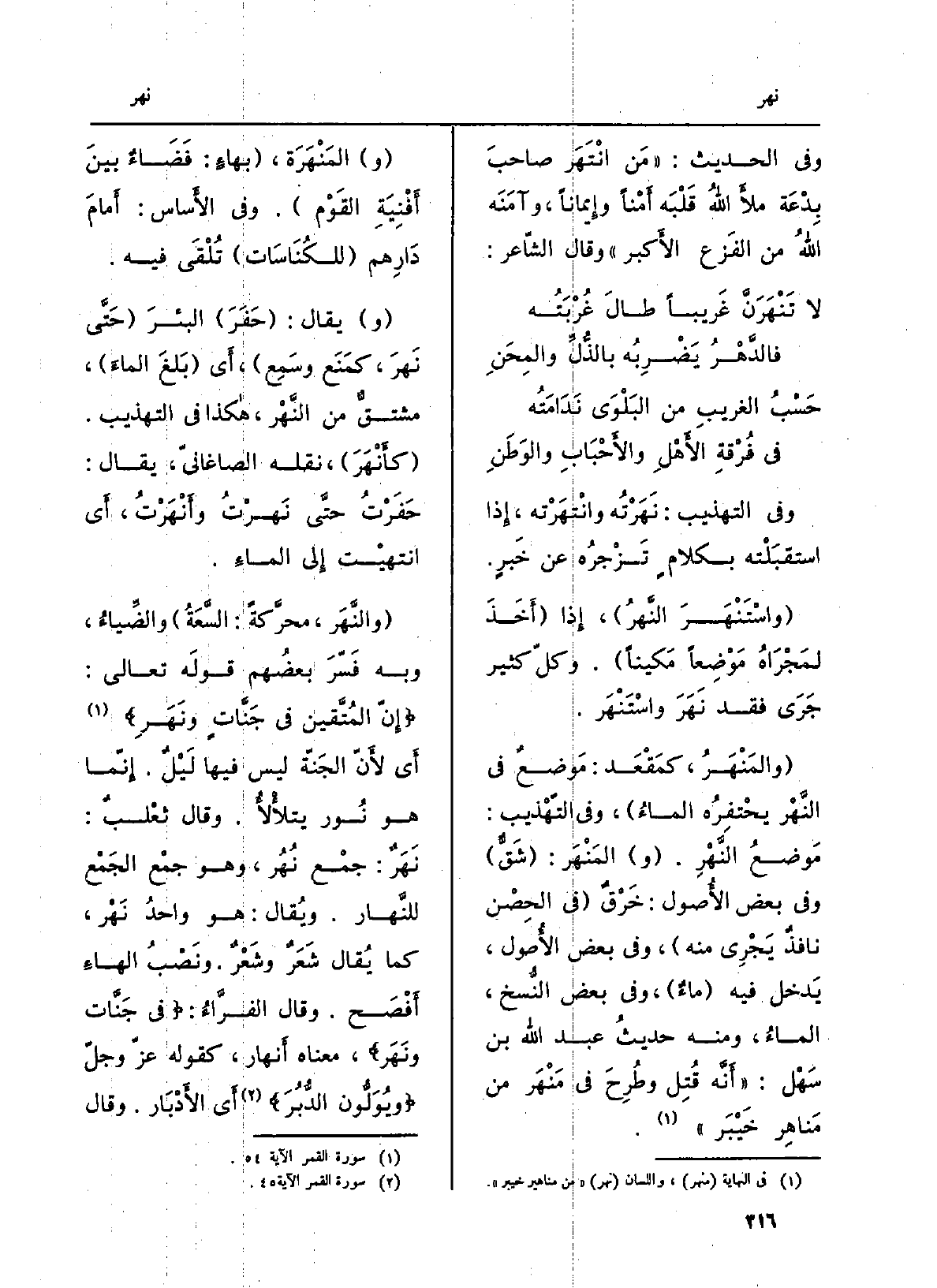المَنْهَر: شَقٌّ، وَفِي بعض الأُصول: خَرْقٌ فِي الحِصْنِ نافذٌ يجْرِي مِنْهُ، وَفِي بعض الأُصول، يدْخل فِيهِ ماءٌ، وَفِي بعض النُّسَخ، الماءُ، وَمِنْه حَدِيث عَبْد الله بن سَهْل أَنَّه قُتِلَ وطُرِحَ فِي مَنْهَر من مَناهِر خَيْبَر. المَنْهَرَة، بهاءٍ: فَضَاءٌ بينَ أَفنِيَة القَوم. وَفِي الأَساس: أَمامَ دارِهم للكناسات تُلْقى فِيهِ. يُقَال: حَفَرَ البئرَ حَتَّى نَهَرَ، كمَنَعَ وسَمِع، أَي بَلَغ الماءَ، مُشْتَقٌّ من النَّهْر، هَكَذَا فِي التّهذيب. كأَنْهَرَ، نَقله الصَّاغانِيّ، يُقَال: حَفَرْتُ حَتَّى نَهَرْتُ وأَنْهَرْتُ، أَي انْتَهَيْت إِلَى المَاء. والنَّهَرُ، مُحَرَّكَةً: السَّعَةُ والضِّياءُ، وَبِه فسَّر بَعضهم قولَه تَعَالَى: إنَّ المُتَّقِينَ فِي جَنَّاتٍ ونَهَرٍ أَي لأَنَّ الجَنَّة لَيْسَ فِيهَا ليلٌ، إنَّما هُوَ نورٌ يتلألأُ. وَقَالَ ثعلبٌ: نَهَرٌ: جمع نُهُر، وَهُوَ جَمع الجَمْع للنَّهار. وَيُقَال: هُوَ واحِدُ نَهْر، كَمَا يُقَال شَعَرٌ وشَعْرٌ. ونَصْبُ الهاءِ أَفصح. وَقَالَ الفَرَّاءُ: فِي جَنَّاتٍ ونَهَر مَعْنَاهُ أَنهار، كَقَوْلِه عزّ وجلّ ويُوَلُّونَ الدُّبُرَ أَي الأَدبار. وَقَالَ