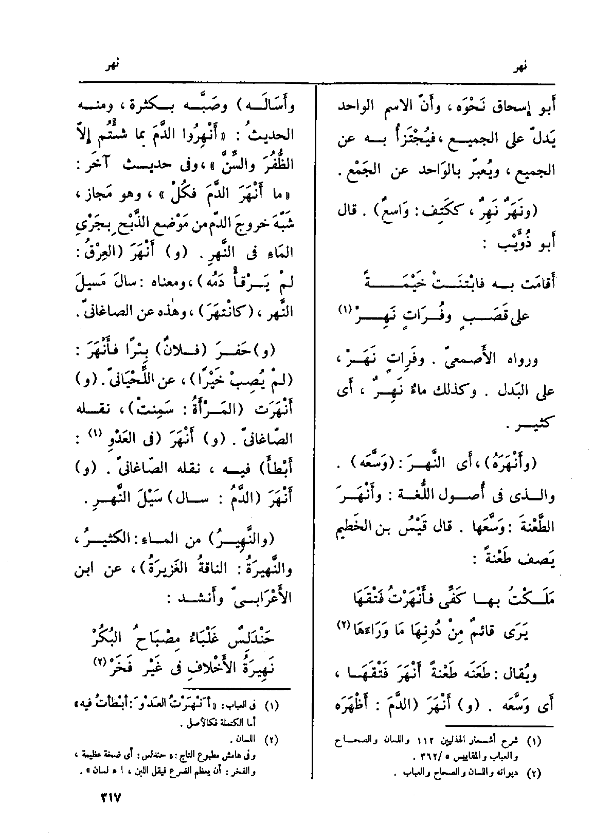 أَبو إِسْحَاق نحوَه، وأَنَّ الِاسْم الْوَاحِد يدلُّ على الْجَمِيع، فيُجْتَزَأُ بِهِ عَن الْجَمِيع، ويُعبّر بِالْوَاحِدِ عَن الجَمْع. ونَهَرٌ نَهِرٌ، ككَتِف: واسِعٌ. قَالَ أَبو ذُؤَيْب: