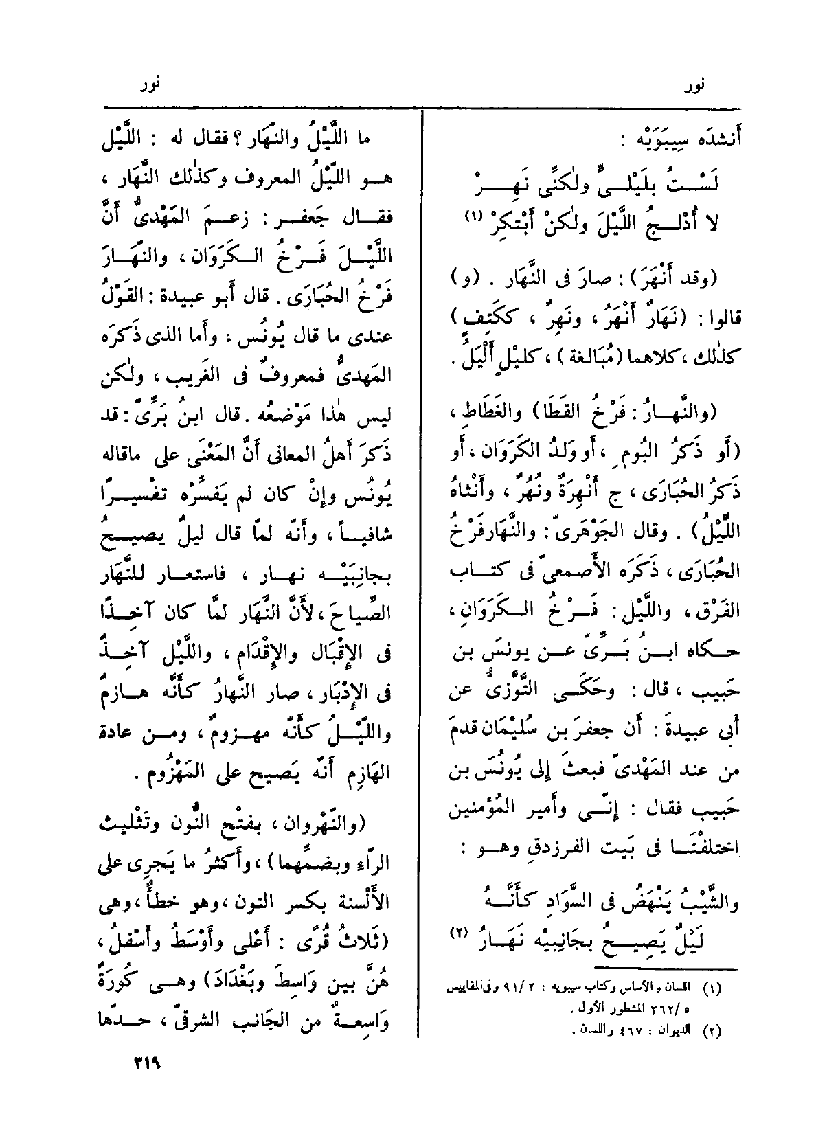 مَا اللَّيْل والنَّهار فَقَالَ لَهُ: اللّيْلُ هُوَ اللَّيْل المَعروف وَكَذَلِكَ النَّهار، فَقَالَ جَعْفَر: زَعَمَ المَهْدِيُّ أَنُّ الليلَ فَرْخُ الكَرَوان، والنَّهارَ فرخُ الحُبارَى. قَالَ أَو عُبَيْدَة: القولُ عِنْدِي مَا قَالَ يونُس، وأَما الَّذِي ذكرَه المَهدِيُّ فمعروفٌ فِي الغَريب، وَلَكِن لَيْسَ هَذَا موضعُه، قَالَ ابنُ بّرِّيّ: قد ذكرَ أَهلُ المَعاني أَنَّ المَعنى على مَا قالَه يونُس وإنْ كَانَ لمْ يُفَسِّرْه تَفْسِيرا شافياً، وأَنَّه لمّا قَالَ ليلٌ يصيحُ بجانبيه نَهارُ، فاسْتَعارَ للنَّهار الصِّياحَ، لأَنَّ النَّهارَ لمّا كَانَ آخِذاً فِي الإقبال والإقدام، والليلُ آخذٌ فِي الإدْبار، صَار النَهارُ كأَنَّه هازمٌ والليلُ كأَنَّه مَهزومٌ، وَمن عَادَة الهازم أَنَّه يَصِيح على المَهزوم. والنَّهْرَوان، بِفَتْح النُّون وتثليث الرَّاءِ وبضَمِّهما، وأَكثرُ مَا يجْرِي على الأَلسِنَة بِكَسْر النُّون، وَهُوَ خَطأٌ وَهِي ثلاثُ قرى: أَعلى وأَوْسَطُ وأَسْفَلُ، هُنَّ بَين واسِطَ وبَغدادَ وَهِي كُورَةٌ واسعةٌ من الْجَانِب الشَّرقيّ، حَدُّها