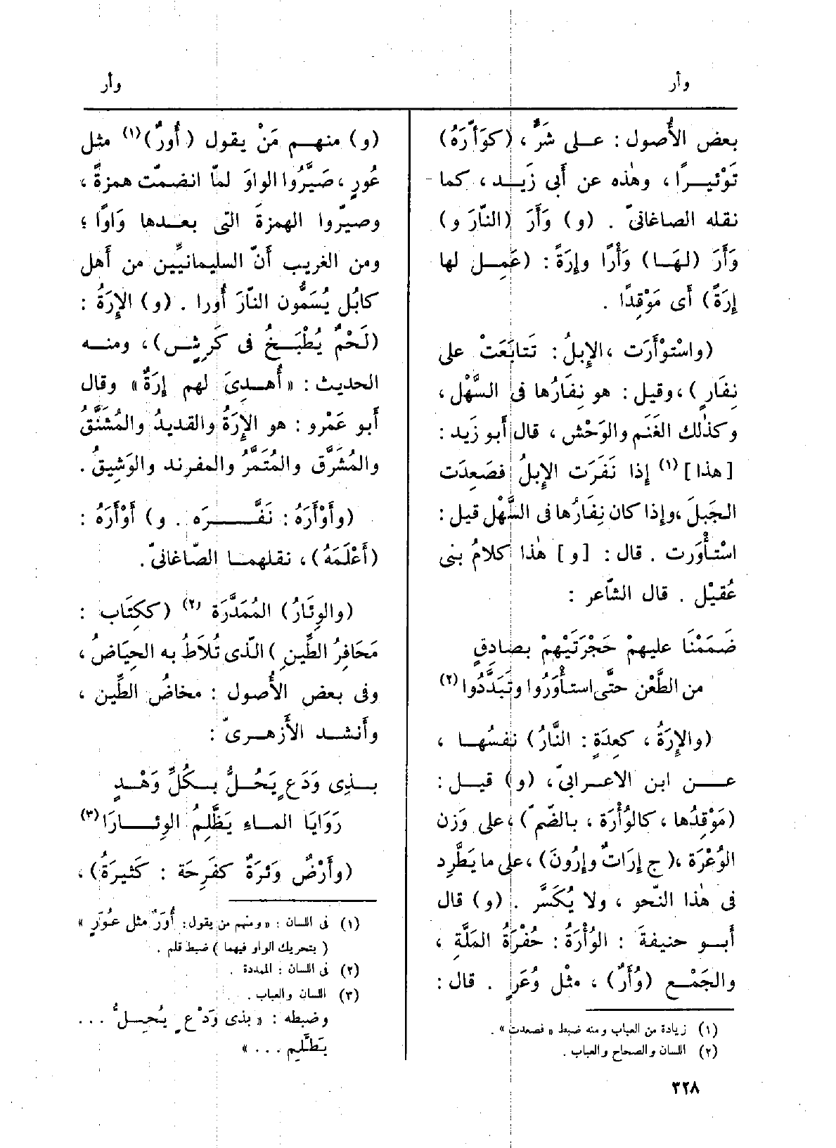{والإرَة، كعِدَةٍ: النارُ نفسُها، عَن ابْن الأَعْرابِيّ، قيل: مَوْقِدها،} كالوُأْرَة، بالضمّ، على وزن الوُعْرَة، ج {إراتٌ} وإرون، على مَا يطَّرِد فِي هَذَا النَّحْو، وَلَا يُكَسَّر. قَالَ أَبُو حنيفَة: {الوُأْرَة: حُفرةُ المِلَّةِ، وَالْجمع} وُأَرٌ، مثل وُعَرٍ. قَالَ: مِنْهُم من يَقُول {أُورٌ مثل عُورٌ، صَيَّروا الواوَ لمّا انضمَّت همزَة، وصيّروا الهمزةَ الَّتِي بعْدهَا واواً وَمن الْغَرِيب أنّ السليمانيِّين من أهل كابُل يُسمُّون النّارَ} أُورا. {الإرَة: لحمٌ يُطبخُ فِي كَرِشٍ، وَمِنْه الحَدِيث: أُهديَ لَهُم} إرَةٌ وَقَالَ أَبُو عَمْرو: هُوَ الإرَةُ والقديدُ والمُشَنَّقُ والمُشَرَّق والمُتَمَّرُ والمفرند والوَشيق. {وأَوْأَرَه: نَفَّره. و) أَوْأَرهُ: أَعْلَمه، نقلهما الصَّاغانِيّ.} والوِئارُ المُمَدَّرة ككِتاب: مَحافِرُ الطِّينِ الَّذِي تُلاط بِهِ الحِياض، وَفِي بعض الْأُصُول: مخاضُ الطين، وَأنْشد الأَزْهَرِيّ: