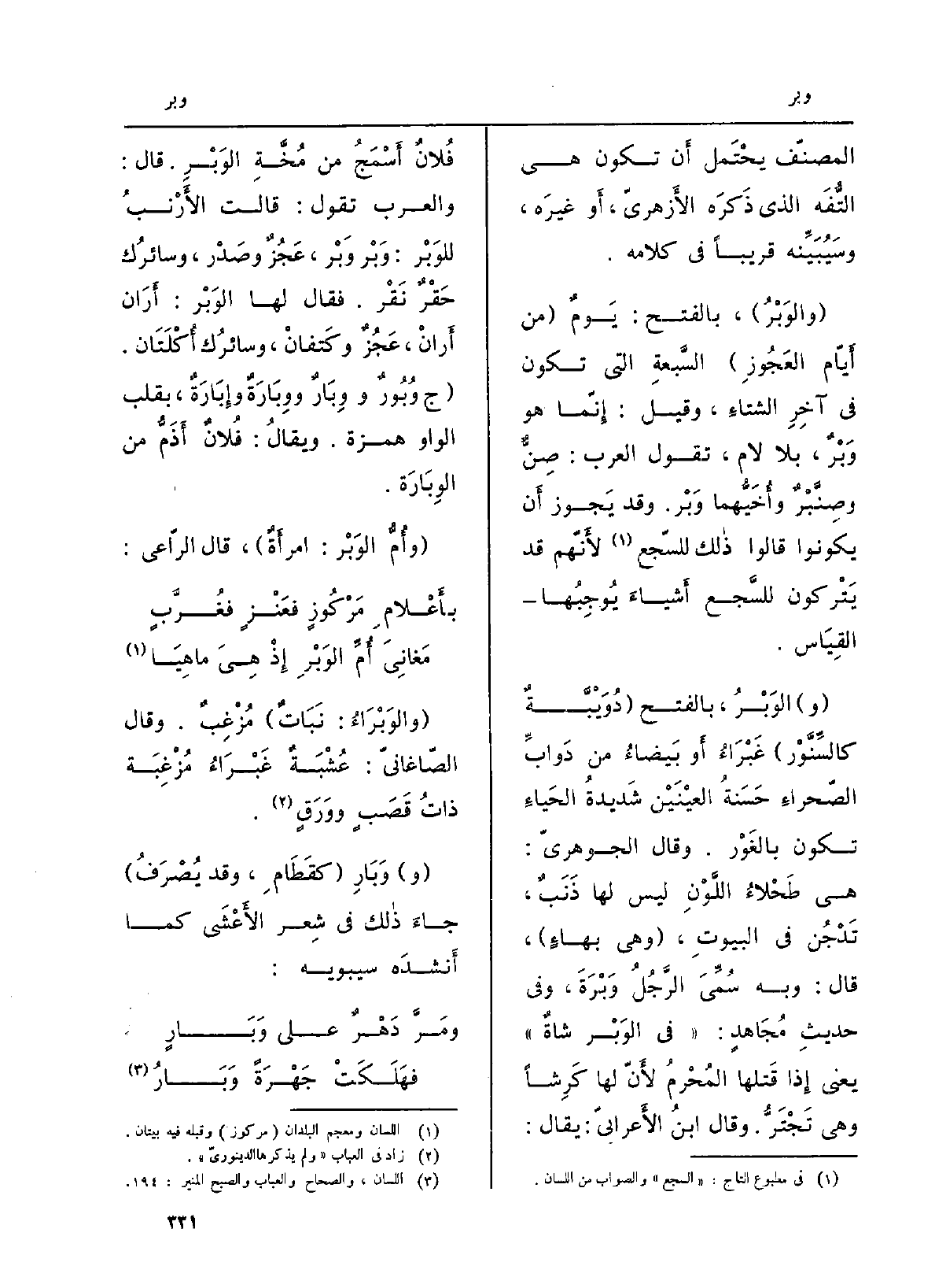 المصنّف يحْتَمل أَن تكون عي التُّفَه الَّذِي ذكره الأَزْهَرِيّ، أَو غَيره، وسيُبَيِّنُه قَرِيبا فِي كَلَامه. {والوَبْر، بِالْفَتْح: يومٌ من أَيَّام العَجوز السبعةِ الَّتِي تكون فِي آخرِ الشتَاء، وَقيل: إنّما هُوَ} وَبْرٌ، بِلَا لَام، تَقول الْعَرَب: صِنٌّ وصِنَّبْرٌ وأُخَيُّهما وَبْر. وَقد يجوز أَن يَكُونُوا قَالُوا ذَلِك للسجع لأنّهم قد يَتْرُكون للسجع أشياءَ يُوجِبُها الْقيَاس. (و) {الوَبْرُ، بِالْفَتْح دُوَيْبَّةٌ كالسِّنَّوْر غَبْرَاءُ أَو بيضاءُ من دوابِّ الصَّحرَاء حَسَنَةُ العَيْنَيْن شديدةُ الحَياءِ تكون بالغَوْر. وَقَالَ الجَوْهَرِيّ: هِيَ طَحْلاءُ اللونِ لَيْسَ لَهَا ذَنَبٌ، تَدْجُنُ فِي الْبيُوت، وَهِي بِهاءٍ، قَالَ: وَبِه سُمِّي الرجلُ} وَبْرَةَ، وَفِي حَدِيث مُجاهد: فِي الوَبْر شاةٌ يَعْنِي إِذا قَتلهَا المُحْرمُ لأنّ لَهَا كَرِشَاً وَهِي تَجْتَرُّ. وَقَالَ ابْن الأَعْرابِيّ: يُقَال: فلانٌ أَسْمَجُ من مُخَّةِ الوَبْر. قَالَ: وَالْعرب تَقول: قَالَت الأرنبُ للوَبْر: وَبْر وَبْر، عَجْزٌ وصَدْر، وسائرك حَقْرٌ نَقْر. فَقَالَ لَهَا الوَبْر: أران أرانْ، عَجُزٌ وكَتفانْ، وسائرُك أُكْلَتان. ج) {وُبورٌ و} وِبارٌ {ووِبارَةٌ} وإبارَةٌ، بقلب الْوَاو همزَة. وَيُقَال: فلانٌ أَذَمُّ من الوِبارَة. وأمُّ الوَبْر: امرأةٌ، قَالَ الرّاعي: