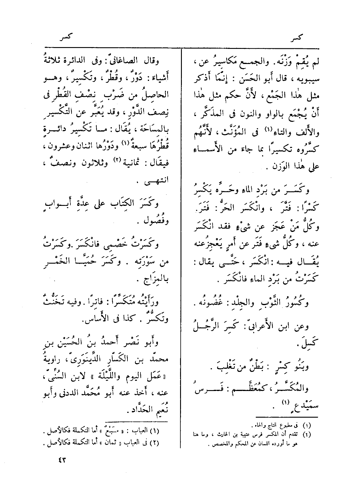 لم يُقِم وَزْنَه. وَالْجمع مَكاسير عَن سِيبَوَيْهٍ، قَالَ أَبُو الْحسن: إنّما أذكر مثل هَذَا الْجمع، لأنّ حكم مثل هَذَا أَن يُجمَع بِالْوَاو وَالنُّون فِي المذكَّر، وَالْألف وَالتَّاء فِي المؤنَّث، لأنَّهم كسَّروه تكسيراً بِمَا جَاءَ من الْأَسْمَاء على هَذَا الْوَزْن. وكَسَرَ من بَرْدِ الماءِ وحرِّه يَكْسِرُ كَسْرَاً: فتَّر، وانْكَسَر الحرُّ: فَتَرَ. وكلُّ من عَجَزَ عَن شيءٍ فقد انْكَسَر عَنهُ، وكلُّ شيءٍ فَتَرَ عَن أمرٍ يَعْجِزُ عَنهُ يُقال فِيهِ: انْكَسَر، حَتَّى يُقال: كَسَرْتُ من بَرْدِ الماءِ فانْكَسَر. وكُسور الثَّوْبِ والجِلْدِ: غُضونُه. وَعَن ابْن الأَعْرابِيّ: كَسِرَ الرَّجُلُ كَسِلَ. وبَنو كِسْرٍ: بَطْنٌ من تَغْلِب. والمُكَسَّرُ، كمُعَظَّم: فَرْسُ سمَيْدَع. وَقَالَ الصَّاغانِيّ: وَفِي الدائرة ثلاثةُ أَشْيَاء: دَوْرٌ، وقُطْرٌ، وتَكْسير، وَهُوَ الحاصِل من ضَرْبِ نِصْفِ القُطْرِ فِي نِصفِ الدَّوْر، وَقد يُعبَّر عَن التَّكْسير بالمِساحَة، يُقال: مَا تَكسير دائرةٍ قُطْرُها سبعةٌ ودَوْرُها اثْنَان وَعِشْرُونَ، فَيُقَال: ثَمَانِيَة وَثَلَاثُونَ ونصفٌ، انْتهى. وَكَسَرَ الكِتابَ على عِدَّةِ أَبْوَاب وفُصول. وكَسَرْتُ خَصْمِي فانْكَسَر. وكَسَرْتُ من سَوْرَتِه. وكَسَرَ حُمَيَّا الخَمْرِ بالمِزاج. ورَأَيْتُه مُتَكَسِّراً: فاتِراً. وَفِيه تَخَنُّثٌ وتَكسُّرٌ. كَذَا فِي الأساس. وَأَبُو نَصْر أحمدُ بنُ الْحُسَيْن بنِ مُحَمَّد بن الكَسَّارِ الدِّينَوَرِيّ، راويةُ: عَمَلَ الْيَوْم وَاللَّيْلَة. لِابْنِ السُنِّيّ، عَنهُ، أَخذ عَنهُ أَبُو مُحَمَّد الددني وَأَبُو نُعَيم الحدَّاد.
