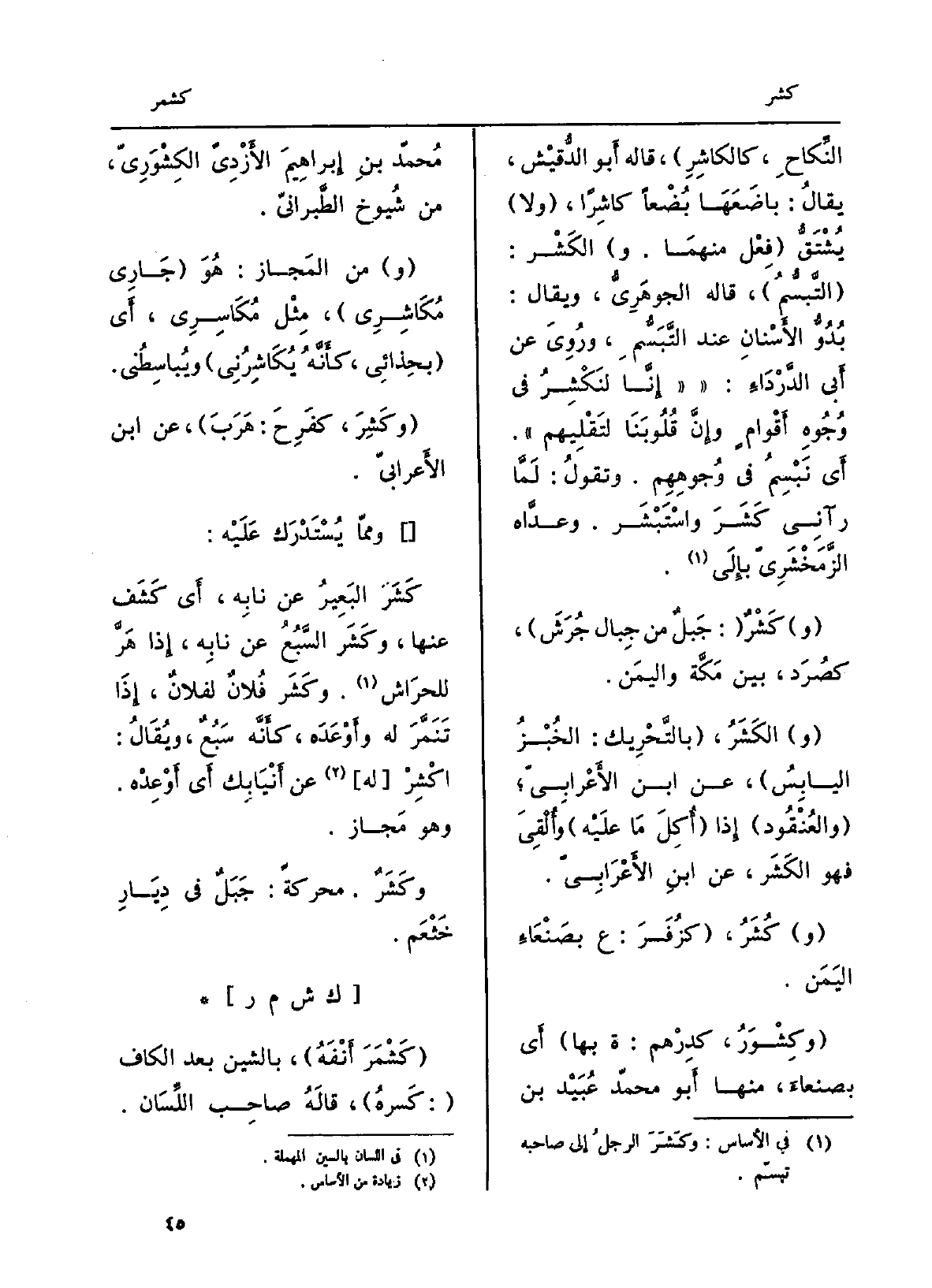 النِّكاح، كالكاشِر، قَالَه أَبُو الدُّقيْش، يُقَال: باضَعَها بُضْعاً كاشِراً، وَلَا يُشْتَقُّ فِعْل مِنْهُمَا. والكَشْر: التَّبَسُّم، قَالَه الجَوْهَرِيّ، وَيُقَال: بُدُوُّ الْأَسْنَان عِنْد التَّبَسُّم، ورُوي عَن أبي الدرداءِ: إنَّا لَنَكْشِرُ فِي وُجوهُ أَقْوَامٍ وإنَّ قُلوبَنا لَتَقْليهم. أَي نَبْسِم فِي وجوهِهم. وَتقول: لمَّا رَآنِي كَشَرَ واستَبْشَر. وعدَّاه الزَّمَخْشَرِيّ بإلى. كَشْرٌ: جبلٌ من جِبال جُرَش، كصُرَد، بَين مكَّة واليمن. الكَشَر، بِالتَّحْرِيكِ: الخُبْزُ اليابِس، عَن ابْن الأَعْرابِيّ والعُنْقود إِذا أُكِل مَا عَلَيْه وأُلقي فَهُوَ الكَشَر، عَن ابْن الأَعْرابِيّ. كُشَر، كزُفَر: ع بصَنْعاء الْيمن. وكِشْوَر، كدِرْهَم: ة بهَا أَي بِصَنْعَاء، مِنْهَا أَبُو مُحَمَّد عُبَيْد بن مُحَمَّد بن إِبْرَاهِيم الأزْدِيّ الكِشْوَرِيّ، من شُيُوخ الطَّبراني. من المَجاز: هُوَ جارِي مُكاشِرِي، مثلُ مُكاسِرِي، أَي بِحِذائي، كأنَّه يُكاشِرُني ويُباسِطُني.