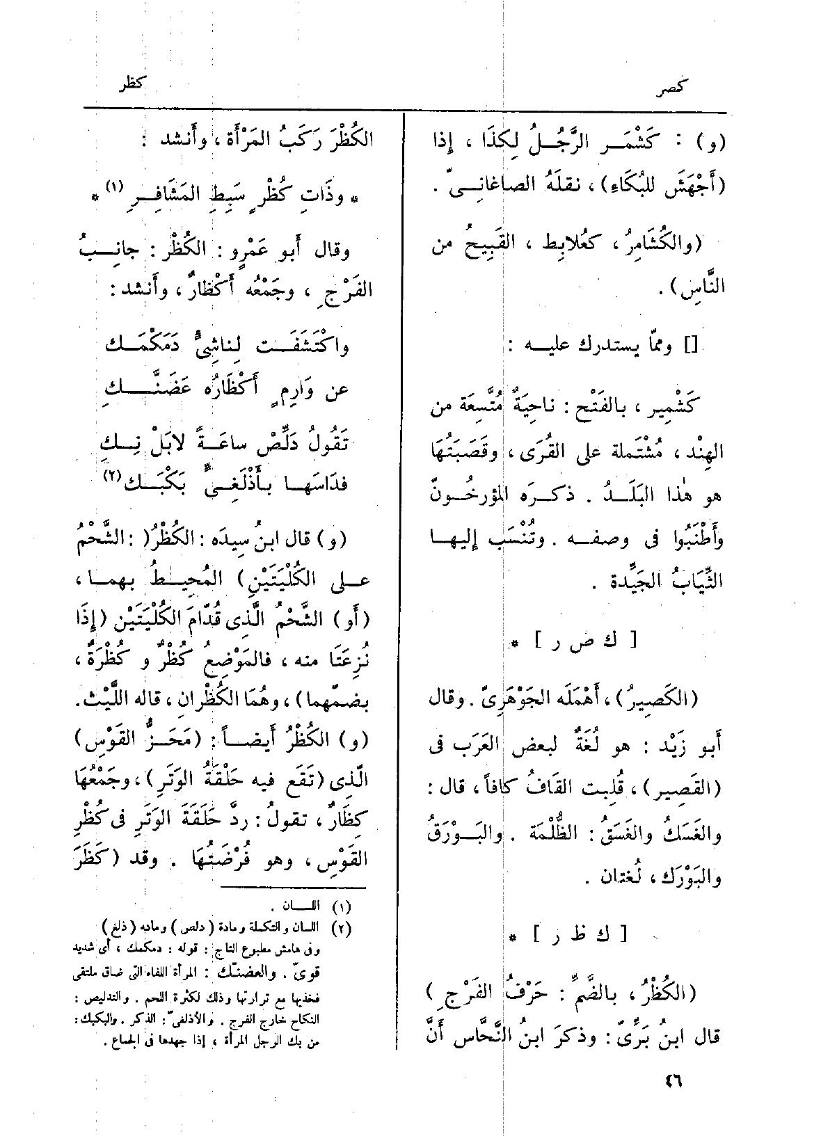 الكُظْر، بالضمّ: حَرْفُ الفَرْجِ. قَالَ ابنُ برِّيّ: وذكرَ ابنُ النَّحَّاس أنَّ الكُظْرَ رَكَبُ الْمَرْأَة، وَأنْشد: وذاتُ كُظْرٍ سَبِطِ المَشافِرِ وَقَالَ أَبُو عَمْرُوٍ: الكُظْر: جانبُ الفَرْج، وجمعُه أَكْظَار، وَأنْشد: