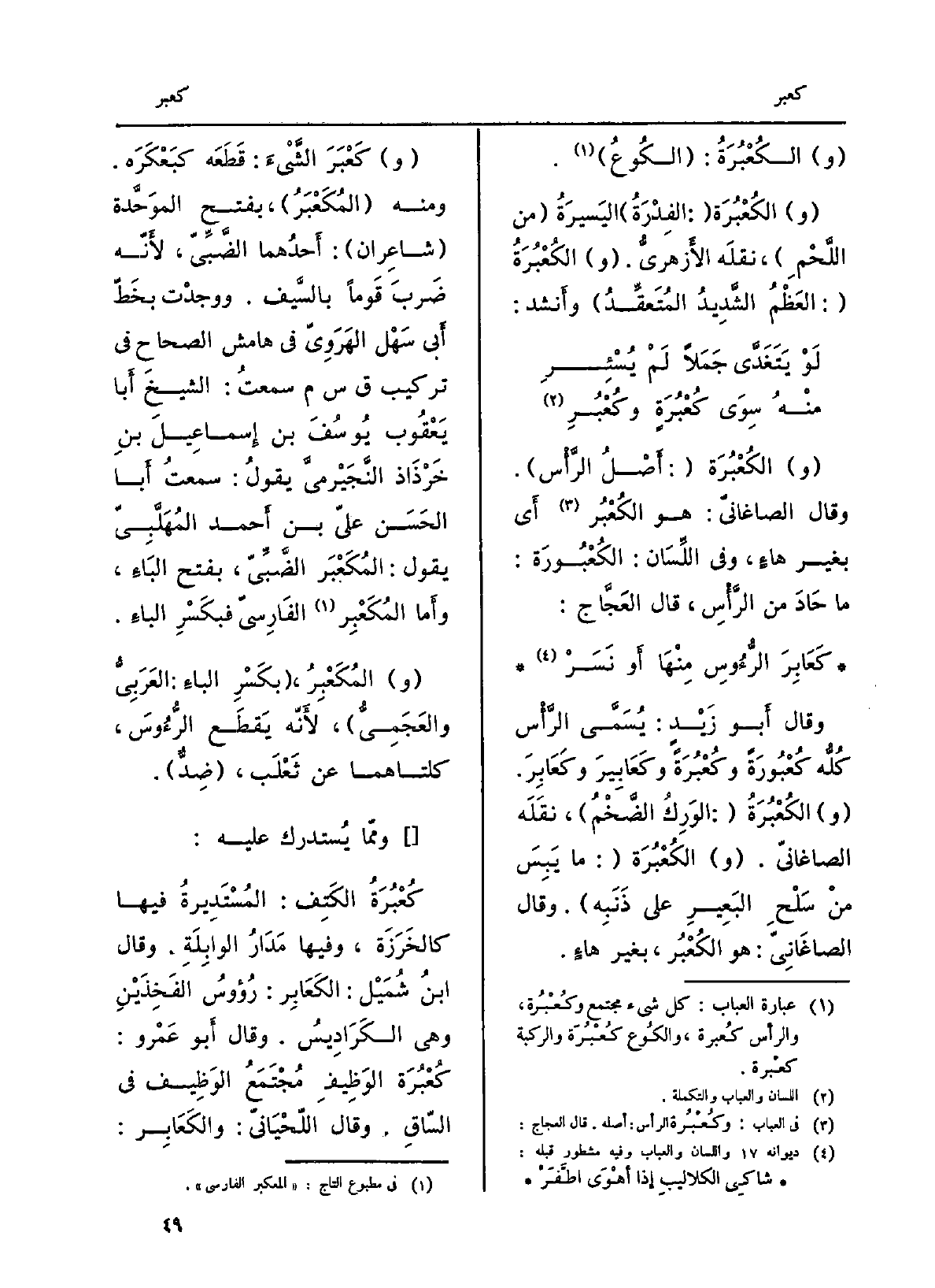 ووجدْت بخطِّ أبي سهل الهَرَوِيّ فِي هَامِش الصِّحاح فِي تركيب ق س م سمعتُ: الشيخَ أَبَا يَعْقُوب يوسُفَ بن إسماعيلَ بنِ خَرْذاذ النَّجَيْرميَّ يَقُول: سمعتُ أَبَا الْحسن عليّ بن أَحْمد المُهَلَّبيّ يَقُول: المُكَعْبَر الضَّبِّيّ بِفَتْح الْبَاء، وَأما المُكَعْبَر الفارسيّ فبكسر الْبَاء. المُكَعْبِرُ، بِكَسْر الْبَاء: العربِيُّ والعَجَمِيُّ، لأَنَّه يقطَعُ الرُّؤوسَ، كلتاهما عَن ثَعْلَب، ضِدٌّ. وَمِمَّا يسْتَدرك عَلَيْهِ: كُعْبُرَةُ الكَتِف: المُستديرةُ فِيهَا كالخَرَزَة، وفيهَا مَدارُ الوابِلَةِ. وَقَالَ ابنُ شُمَيْل: الكَعابِرُ: رؤوسُ الفَخِذَيْنِ وَهِي الكَراديسُ. وَقَالَ أَبُو عَمْرو: كُعْبُرَةُ الوَظيفِ مُجتَمَعُ الوَظيف فِي السّاقِ. وَقَالَ اللّحيانيّ: والكعابِر: