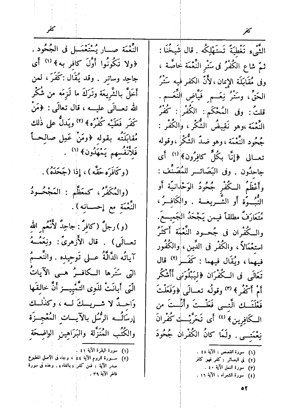 النبوَّة أَو الشَّريعة. والكافرُ مُتَعارَفٌ مطلَقاً فِيمَن يجحَدُ الجميعَ. والكفران فِي جُحود النِّعْمَة أَكثرُ اسْتِعْمَالا، والكُفرُ فِي الدِّينِ، والكُفورُ فيهمَا، وَيُقَال فيهمَا: كَفَرَ، قَالَ تَعَالَى فِي الكفرات: لِيَبْلُوَني أَأَشكُرُ أَمْ أَكْفُر وقَوْلُهُ تَعالى وَفَعَلْتَ فَعْلَتَكَ الَّتِي فَعَلْتَ وأَنتَ من الْكَافرين أَي تَحَرَّيْتَ كُفرانَ نِعمتي. وَلما كَانَ الكُفران جُحودَ النِّعْمَة صَار يُستعمَلُ فِي الجُحود. وَلَا تَكونُوا أَوَّلَ كافِرٍ بِهِ أَي جاحِد وساتِر. وَقد يُقَال: كَفَرَ، لمن أَخَلَّ بالشَّريعة وتركَ مَا لزِمَه من شُكْر اللهِ تَعَالَى عَلَيْهِ، قَالَ تَعَالَى: مَنْ كَفَرَ فعَليْه كُفرُه ويدلُّ على ذلكَ مُقابلتُه بقوله: ومَنْ عمِلَ صَالحا فَلأَنْفُسِهِمْ يَمْهَدون. وكافَرَه حَقَّه، إِذا جَحَدَه. والمُكَفَّرُ، كمعَظَّم: المَجحودُ النِّعمَةِ مَعَ إحسانِه.