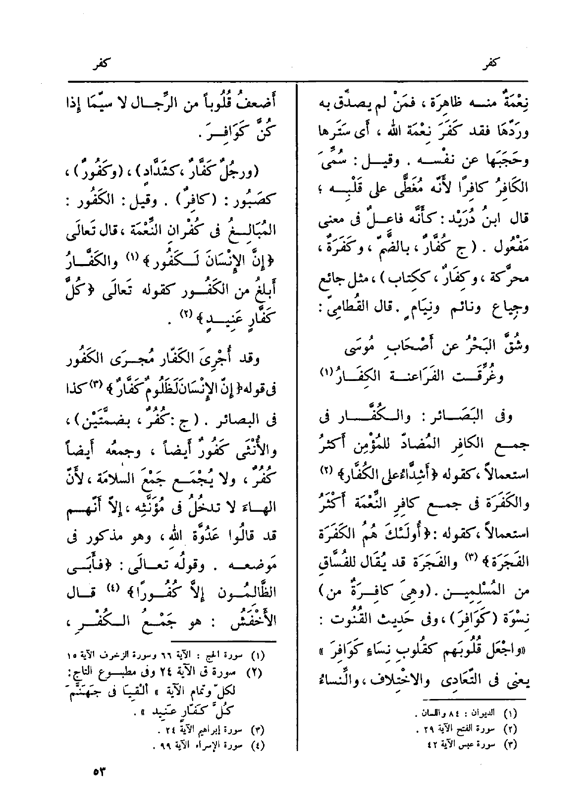 وَفِي البصائر: والكُفَّار فِي جمع الْكَافِر المضادّ لِلْمُؤمنِ أَكثرُ اسْتِعْمَالا، كَقَوْلِه أَشِدَّاءُ على الكُفَّار. والكَفَرَة فِي جمع كَافِر النِّعمة أَكثرُ اسْتِعْمَالا، كَقَوْلِه: أُولئِكَ هُمُ الكَفَرَة الفَجَرَة، والفجرة قد يُقَال للفُسَّاقِ من الْمُسلمين. وَهِي كافِرَةٌ من نِسوَة كَوافِر، وَفِي حَدِيث الْقُنُوت: واجْعَلْ قلوبَهُم كقُلوبِ نساءٍ كَوافِرَ يَعْنِي فِي التّعادي وَالِاخْتِلَاف، والنِّساءُ أَضعفُ قلوباً من الرِّجال لَا سيَّما إِذا كُنَّ كَوافِرَ. ورجُلٌ كَفَّارٌ، كَشَدَّادٍ، وكَفورٌ، كصَبور: كافِرٌ. وَقيل: الكَفور: المُبالِغُ فِي كُفران النِّعمة، قَالَ تَعَالَى: إنَّ الإنسانَ لَكَفور والكَفَّارُ أَبلغُ من الكَفور كَقَوْلِه تَعَالَى كُلَّ كَفَّارٍ عَنيدٍ. وَقد أُجرِيَ الكَفَّار مُجرى الكَفور فِي قَوْله: إنَّ الإنسانَ لَظَلومٌ كَفَّارٌ كَذَا فِي البصائر. جمع كُفُرٌ، بضَمَّتين، وَالْأُنْثَى كَفورٌ أَيضاً، وَجمعه أَيْضا كُفُرٌ، وَلَا يجمَع جَمعَ السَّلامة، لأنَّ الهاءَ لَا تدخلُ فِي مُؤَنَّثه، إلاّ أَنَّهم قد قَالُوا عَدُوَّةَ اللهِ، وَهُوَ مَذكورٌ فِي مَوضعه. وَقَوله تَعَالَى: فَأَبى الظَّالِمونَ إلاّ كُفُوراً قَالَ الأَخفشُ: هُوَ جَمْعُ الكُفْرِ،