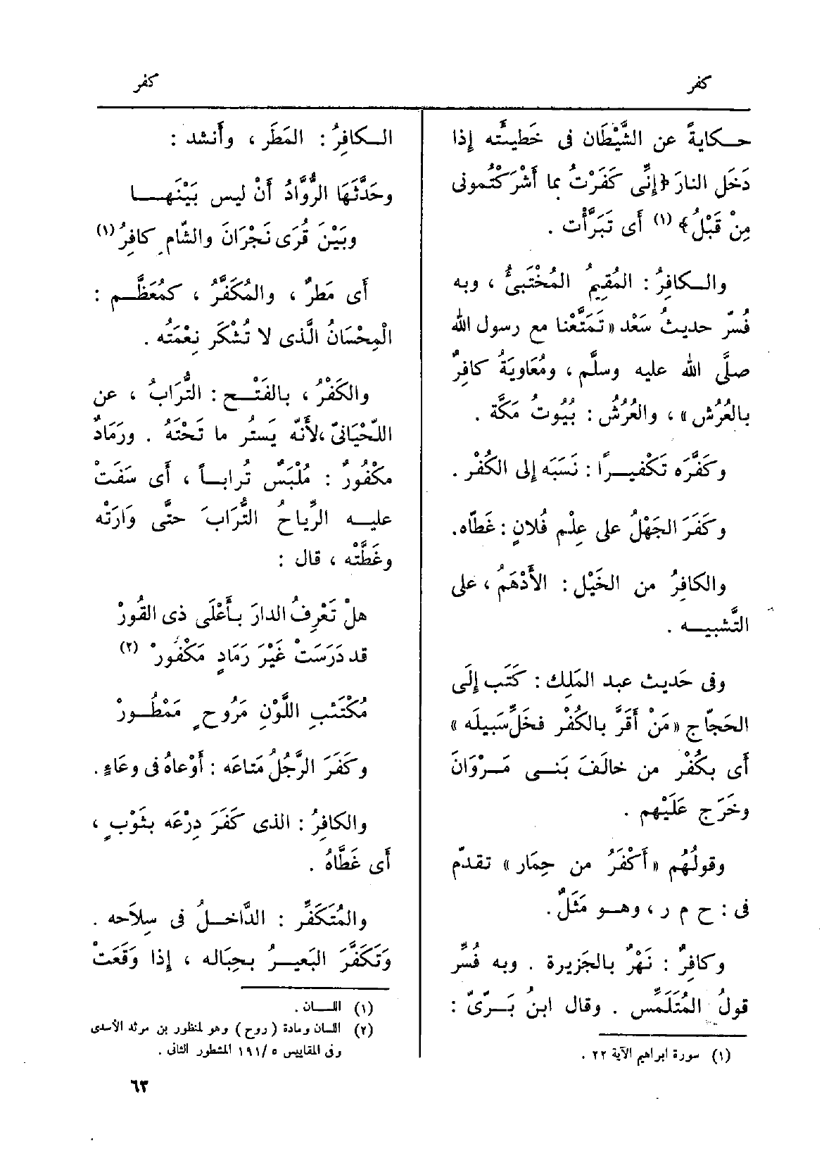 حِكَايَة عَن الشَّيْطان فِي خَطيئتِه إِذا دخل النَّار: إنِّي كفرْتُ بِمَا أَشْرَكْتموني من قبل أَي تبَرَّأْت. والكافِر: المُقيم المُخْتَبِئ، وَبِه فُسِّر حَدِيث سعد: تَمَتَّعنا مَعَ رَسُول الله صلّى الله عَلَيْهِ وسلَّم، ومُعاوية كافِرٌ بالعُرُش، والعُرُش: بيُوت مَكَّة. وكَفَّرَه تَكْفِيراً: نَسَبَه إِلَى الكُفْر. وَكَفَر الجهلُ على عِلْم فلانٍ: غَطَّاه. والكافِرُ من الخَيْل: الأَدْهَم، على التَّشْبِيه. وَفِي حَدِيث عبد الْملك: كَتَبَ إِلَى الحَجَّاج: من أقرَّ بالكُفْر فخَلِّ سبيلَه. أَي بكُفْر من خالَف بَني مَرْوَان وَخَرَج عَلَيْهم. وقولُهم: أَكْفَرُ من حِمار، تقدّم فِي حمر، وَهُوَ مَثَلٌ. وكافِرٌ: نهرٌ بالجزيرة. وَبِه فُسِّر قولُ المُتَلَمِّس. وَقَالَ ابنُ برِّيّ: الكافِر: المَطَر، وَأنْشد: