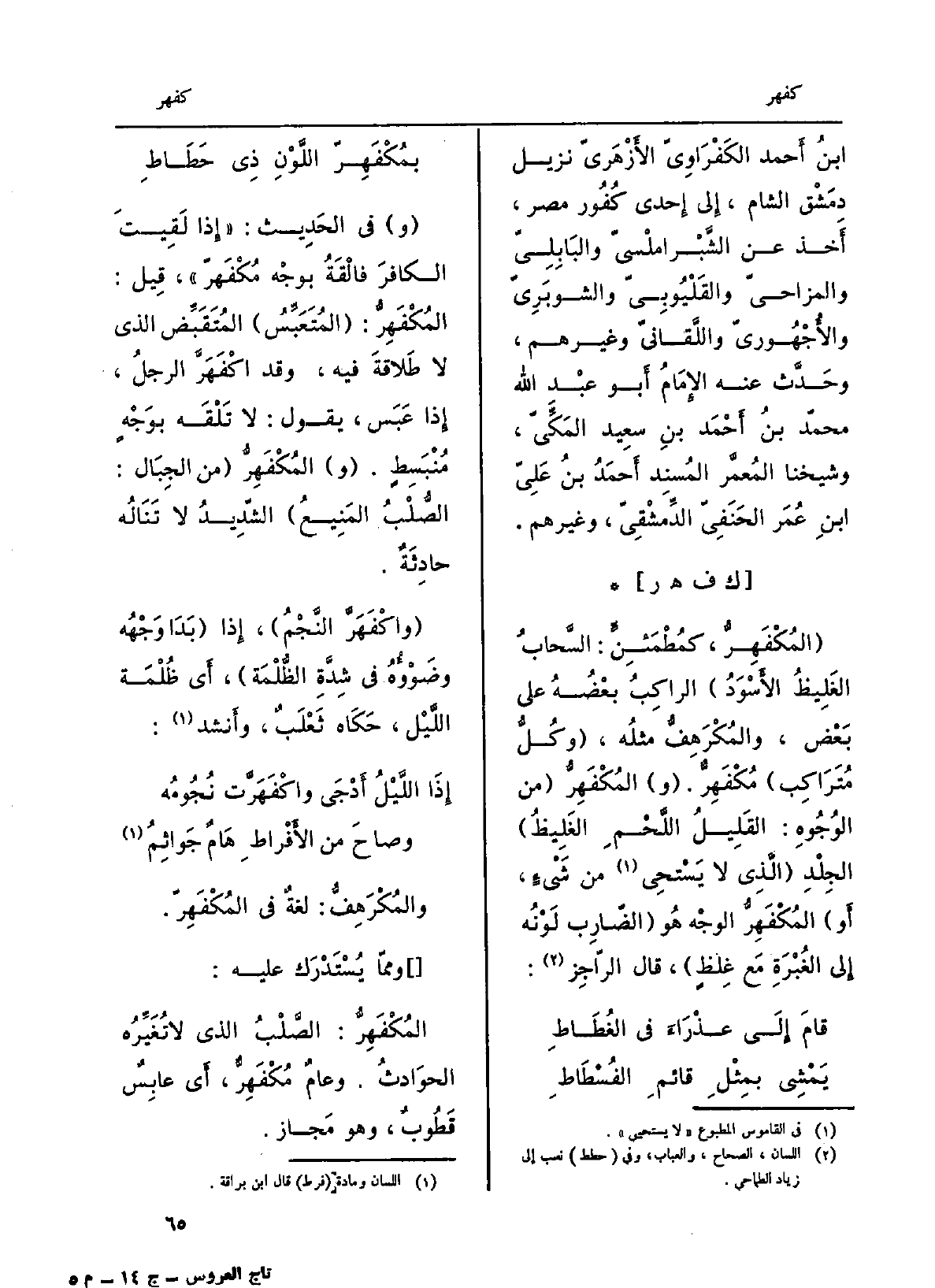 بمُكْفَهِرِّ اللَّوْنِ ذِي حَطَاطِ فِي الحَدِيث: إِذا لَقيتَ الكافرَ فالْقَهُ بوَجْه مُكْفَهِرّ. قيل: المُكْفَهِرُّ: المُتَعَبِّس المُتَقَبِّض الَّذِي لَا طَلاقَة فِيهِ، وَقد اكْفَهَرَّ الرجلُ، إِذا عَبَس، يَقُول: لَا تَلْقَه بوجْهٍ مُنْبَسِطٍ. المُكْفَهِرُّ من الجِبال: الصُّلْبُ المَنيع الشَّديدُ لَا تَنالُه حادِثة. واكْفَهَرَّ النَّجْمُ، إِذا بدا وَجْهُه وضَوؤُهُ فِي شِدَّةِ الظُّلْمَة، أَي ظُلْمَةِ اللَّيْل، حَكاه ثَعْلَب، وَأنْشد: