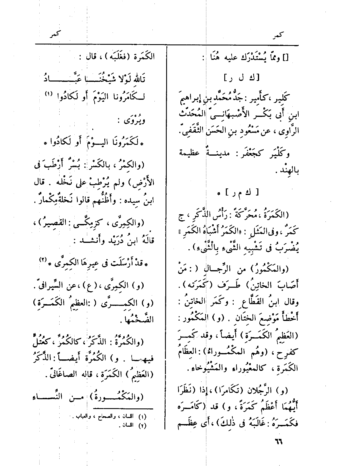المَكْمور: العظيمُ الكَمَرَة أَيْضا، وَقد كَمِرَ كفرِح، وهم المَكْموراء: العِظامُ الكَمَرة، كالمَعْيوراء والمَشْيوخاء. الرَّجُلان تَكامَرا، إِذا نَظَرَا أيُّهُما أَعْظَمُ كَمَرَةً، وَقد كامَرَه فَكَمَره: غالَبَه فِي ذَلِك، أَي عِظَم الكَمَرة فَغَلَبه، قَالَ: