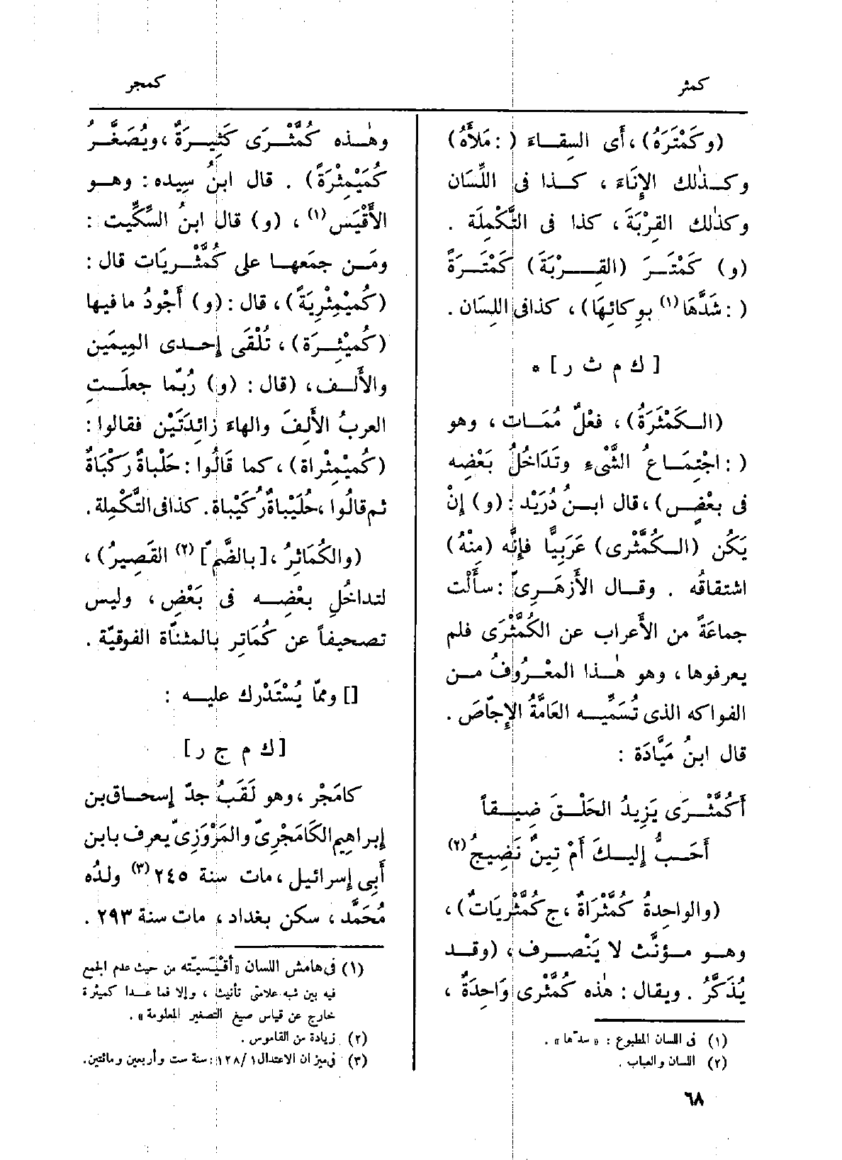 والواحدةُ كُمَّثْراةٌ، ج كُمَّثْرَيَاتٌ، وَهُوَ مؤنث لَا يَنْصَرِف، وَقد يُذكَّر. وَيُقَال: هَذِه كُمَّثْرى واحدةٌ وَهَذِه كُمَّثْرى كَثيرةٌ، ويُصغَّر كُمَيْمِثْرَةٌ. قَالَ ابنُ سيدَه: وَهُوَ الأَقْيَس، قَالَ ابنُ السِّكِّيت: ومَن جَمَعَها على كُمَّثْرِيَات قَالَ: كُمَيْمِثْرِيَة، قَالَ: أَجْوَدُ مَا فِيهَا كُمَيْثِرَة، تُلقى إِحْدَى المِيمَيْن وَالْألف، قَالَ: رُبمَا جعلتِ العربُ الألفَ والهاءَ زائدتَيْن فَقَالُوا: كُمَيْمِثْراة، كَمَا قَالُوا: حَلْبَاةٌ رَكْبَاةٌ ثمَّ قَالُوا: حُلَيْباةٌ رُكَيْباة. كَذَا فِي التَّكْمِلَة. والكُماثِر، بالضمّ القَصير، لتداخُلِ بعضِه فِي بعض، وَلَيْسَ تصحيفاً عَن كُماتِر بالمثنَّاة الفوقيّة. وَمِمَّا يُستدرَك عَلَيْهِ: