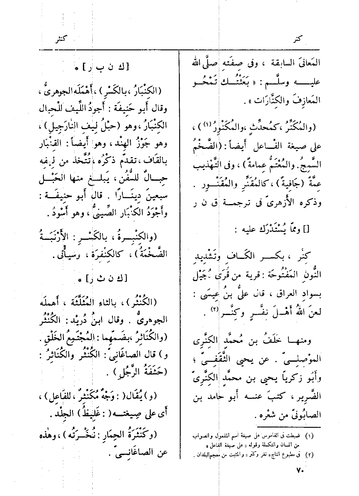 الْمعَانِي السَّابِقَة، وَفِي صفتِه صلّى الله عَلَيْهِ وسلَّم: بَعَثْتُك تَمْحُو المَعازِفَ والكِنَّارات. والمُكَنِّر، كمُحَدِّث، والمُكَنْوَر، على صِيغَة الْفَاعِل أَيْضا: الضخمُ السَّمِج. والمُعْتَمُّ عِمامةً، وَفِي التَّهْذِيب عِمَّةً جافِيةً، كالمُقَنِّر والمُقَنْوِر. وَذكره الأَزْهَرِيّ فِي تَرْجَمَة قنر.