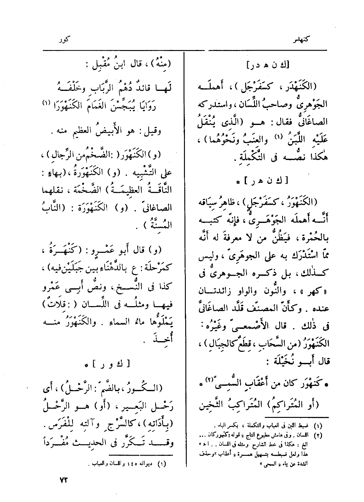 الكَنَهْوَر، كَسَفَرْجَل، ظاهِرُ سِياقه أنّه أهمله الجَوْهَرِيّ، فَإِنَّهُ كَتَبَه بالحُمرة، فيظُنُّ من لَا مَعْرِفة لَهُ أنّه مِمَّا استدرَك بِهِ على الجَوْهَرِيّ، وَلَيْسَ كَذَلِك، بل ذكره الجَوْهَرِيّ فِي كهر، وَالنُّون وَالْوَاو زائدتان عِنْده. وكأنّ المصنّف قلَّد الصَّاغانِيّ فِي ذَلِك. قَالَ الأصْمَعِيّ وغَيْرُه: الكَنَهْوَر من السَّحاب، قِطَعٌ كالجبال، قَالَ أَبُو نُخَيْلَة: كَنَهْور كَانَ من أعقابِ السُّمِيّ أَو المُتَراكِمُ المُتَراكِبُ الثَّخين مِنْهُ، قَالَ ابنُ مُقبِل: