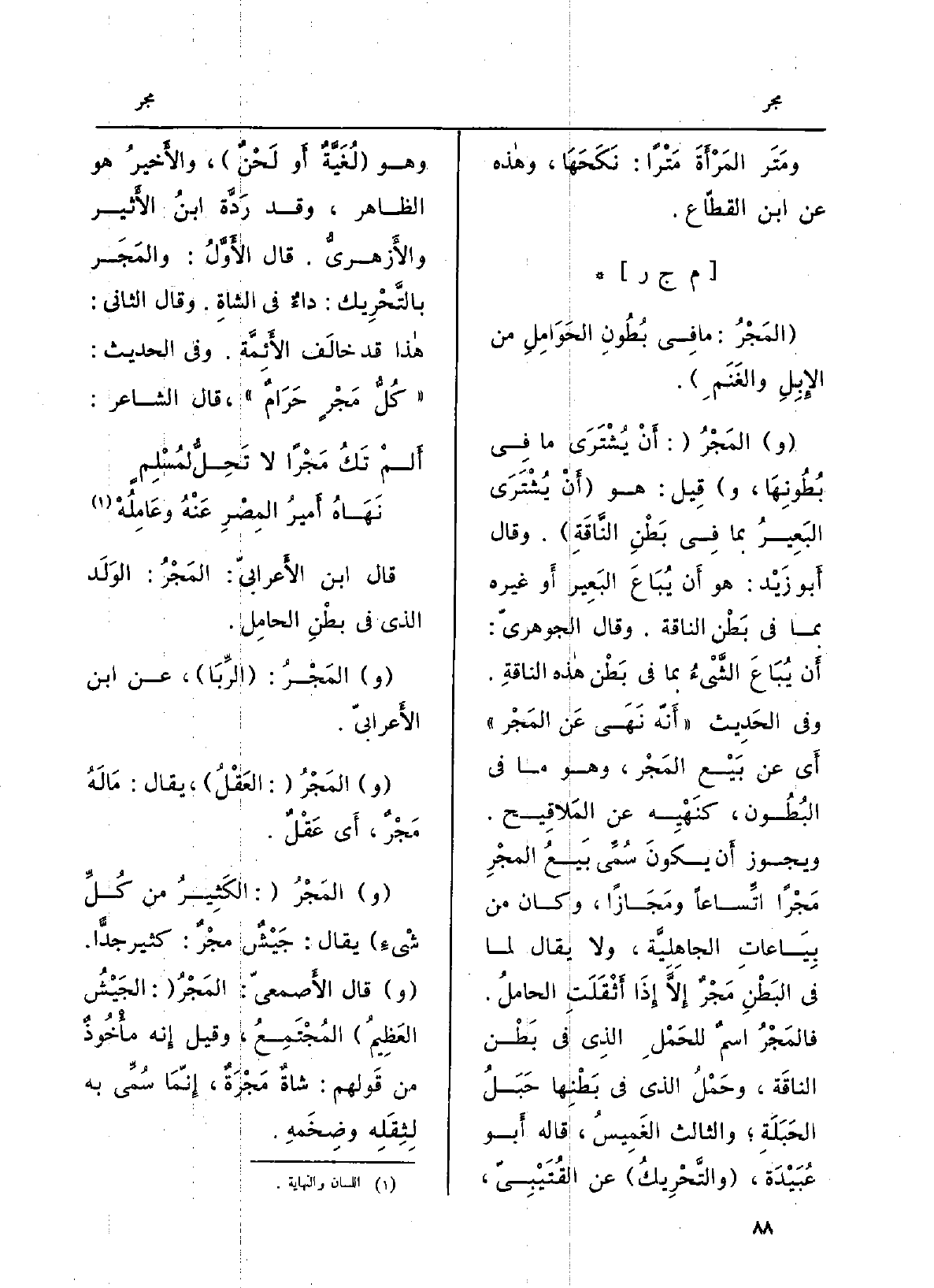 المَجْرُ: مَا فِي بُطونِ الحَوامِلِ من الإبلِ والغَنَمِ. والمَجْرُ: أَنْ يُشْتَرى مَا فِي بطونِها، وقيلَ: هُوَ أَنْ يُشْتَرى البعيرُ بِمَا فِي بطنِ النَّاقة. وَقَالَ أَبُو زيد: هُوَ أَنْ يُباعَ البَعِير أَو غيرُه بِمَا فِي بطنِ النَّاقة. وَقَالَ الجَوْهَرِيّ: أَن يُباعَ الشَّيءُ بِمَا فِي بطن هَذِه النَّاقة. وَفِي الحَدِيث أَنَّه نَهَى عَن المَجْر أَي عَن بيع المَجْر، وَهُوَ مَا فِي الْبُطُون، كنَهيِه عَن المَلاقيح. وَيجوز أَن يكون سُمِّيَ بَيعُ المَجْر مَجراً اتِّساعاً ومَجازاً، وَكَانَ من بِياعاتِ الجاهِليَّة، وَلَا يُقَال لما فِي البطنِ مَجْرٌ إلاّ إِذا أَثْقَلَتِ الحامِلُ. فالمَجْرُ اسمٌ للحملِ الَّذِي فِي بطنِ النّاقة، وحَمْلُ الَّذِي فِي بطنِها حَبَلُ الحَبَلَةِ، والثالثُ الغَميسُ، قَالَه أَبُو عُبيدة، والتَّحريكُ عَن القُتَيْبِيّ، وَهُوَ لُغَيَّةٌ أَو لَحْنٌ، والأخير هُوَ الظَّاهر، وَقد ردَّه ابْن الأَثير والأَزهريُّ. قَالَ الأَوَّلُ: والمضجَر بالتَّحريك: داءٌ فِي الشَّاةِ. وَقَالَ الثَّانِي: هَذَا قد خَالف الْأَئِمَّة. وَفِي الحَدِيث: كُلُّ مَجْرٍ حَرامٌ، قَالَ الشَّاعِر: