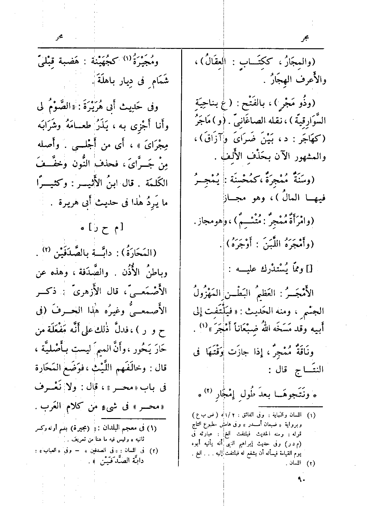 المَحَارَةُ: دابَّة بالصَّدَفَيْن. وباطنُ الأُذُن. والصَّدفة، وَهَذِه عَن الأَصمعيّ، قَالَ الأَزهَريّ: ذكر الأصمعيُّ وغيرُه هَذَا الحرفَ فِي حور، فدلَّ ذَلِك على أنَّه مَفْعَلَة من حَارَ يَحورُ، وأَنَّ الميمَ لَيست بأَصليَّة، قَالَ: وخالفَهم اللَّيْث، فوضعَ المَحارَة فِي بَاب محر، قَالَ: وَلَا نَعْرِف محر فِي شيءٍ من كَلَام الْعَرَب.