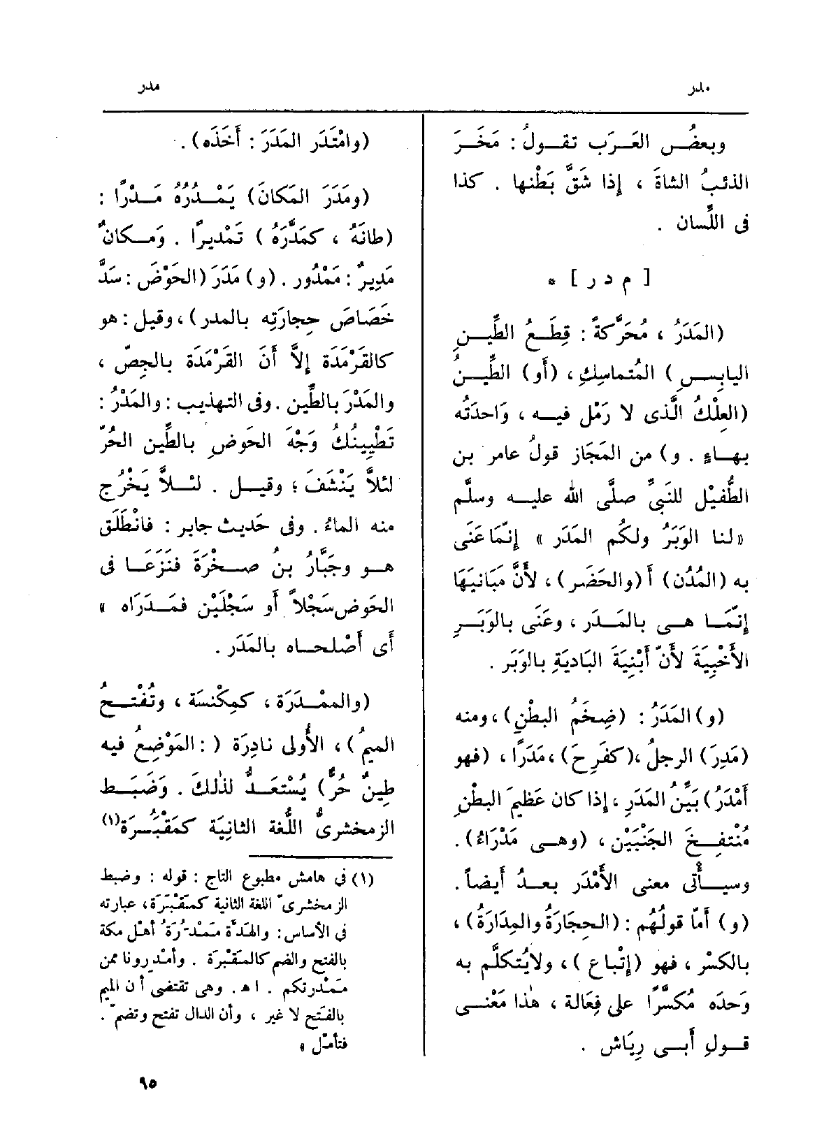 وامْتَدَر المَدَر: أَخَذَه. وَمَدَر الْمَكَان يَمْدُرُه مَدْرَاً: طانَه، كمَدَّرَه تَمْدِيراً. ومكانٌ مَدِيرٌ: مَمْدُور. مَدَرَ الحَوْضَ: سَدَّ خَصاصَ حِجارَتِه بالمدر، وَقيل: هُوَ كالقَرْمَدَة إلاّ أنّ القَرْمَدَة بالجِصّ، والمَدْرَ بالطِّين. وَفِي التَّهْذِيب: والمَدْرُ: تَطْيِينُكَ وَجْهَ الحَوضِ بالطِّين الحُرّ لئلاّ يَنْشَف وَقيل: لئلاّ يَخْرُج مِنْهُ المَاء. وَفِي حَدِيث جَابر: فانطَلَق هُوَ وجبَّارُ بن صَخْرَة فَنَزَعا فِي الحَوْض سَجْلاً أَو سَجْلَين فَمَدَراه. أَي أَصْلَحاه بالمَدَر. والممْدَرَة، كمِكْنَسَة، وتُفتَح الْمِيم، الأُولى نادِرة: الموضعُ فِيهِ طِينٌ حُرٌّ يُستعَدُّ لذَلِك. وَضَبَط الزمخشريُّ اللُّغَة الثانيةَ كمَقْبَرَة