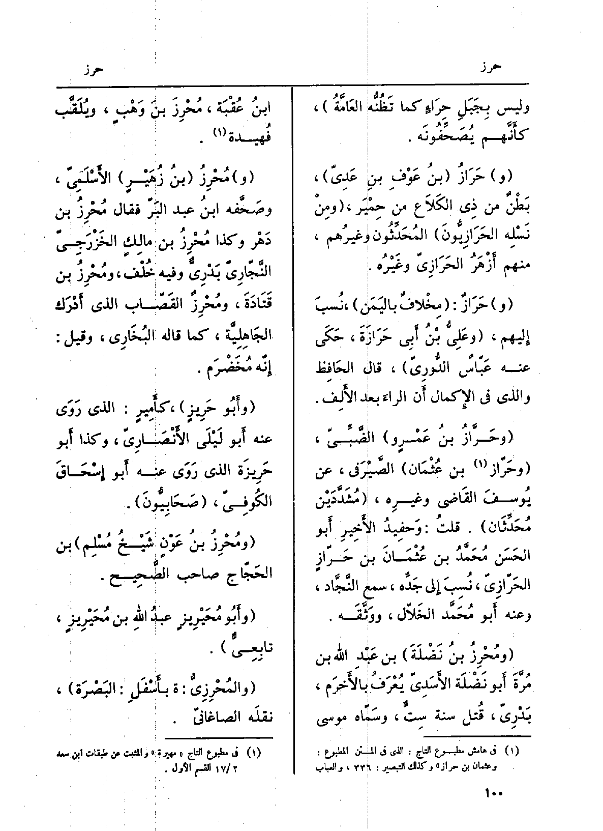 وحَرَّازُ بنُ عمروٍ الضَّبِّيَ، وحَرّازُ بن عُثْمَان الصَّيْرَفيّ، عَن يوسفَ القَاضِي وغيرِه، مُشدَّدَيْن مُحدِّثان. قلتُ: وحفيدُ الأخيرِ أَبُو الْحسن مُحَمَّد بن عُثْمَان بن حَرّازٍ الحَرّازيّ، نُسِبَ إِلَى جدِّه، سمع النَّجَّاد، وَعنهُ أَبُو مُحَمَّد الخَلاّل، ووَثَّقَه. ومُحْرِزُ بنُ نَضْلَةَ بن عَبْد الله بن مُرَّةَ أَبُو نَضْلَةَ الأسَديّ يُعرَفُ بالأَخْرَم، بَدْرِيّ، قُتِلَ سنة سِتٍّ، وسَمَّاه مُوسَى ابنُ عُقْبَة، مُحْرِزُ بن وَهْبٍ، ويُلَقَّب فُهَيْدة. مُحْرِزُ بنُ زُهَيْر الأَسْلَميّ، وصَحَّفه ابنُ عبد البَرّ فَقَالَ مُحْرِزُ بن دَهْر وَكَذَا مُحْرِزُ بن مالكٍ الخَزْرَجيّ النَّجَّاريّ بَدْرِيٌّ وَفِيه خُلْف، ومُحْرِزُ بن قَتادة، ومُحْرِزٌ القَصّاب الَّذِي)