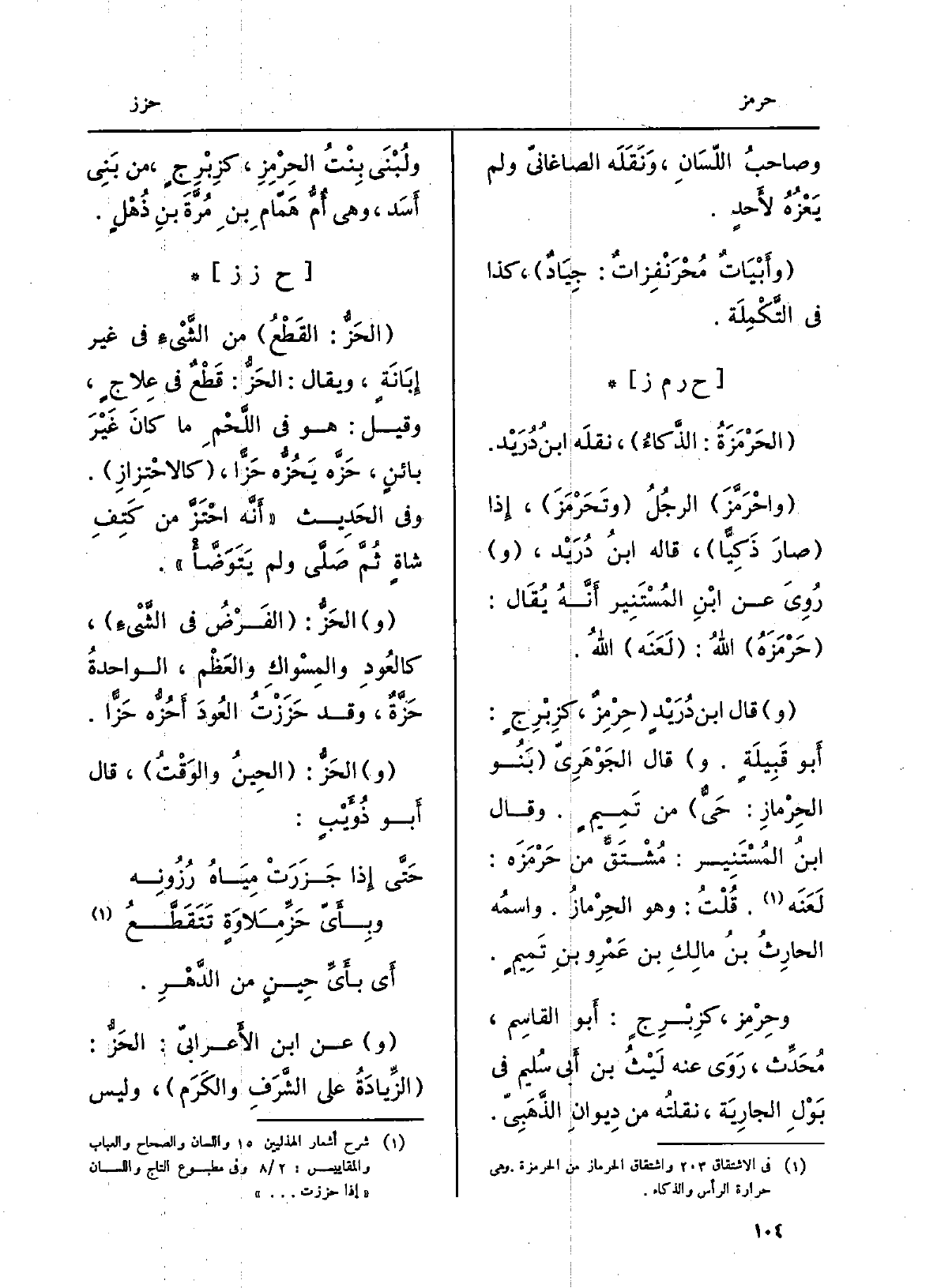 الحَرْمَزَة: الذَّكاء، نَقله ابنُ دُرَيْد. واحْرَمَّزَ الرجلُ وتحَرْمَزَ، إِذا صَار ذَكِيّاً، قَالَه ابنُ دُرَيْد، رُوِيَ عَن ابنِ المُستَنير أنّه يُقَال: حَرْمَزَه اللهُ: لَعَنَه اللهُ. قَالَ ابنُ دُرَيْد: حِرْمِزٌ، كزِبْرِجٍ: أَبُو قبيلةٍ. وَقَالَ الجَوْهَرِيّ بَنو الحِرْماز: حَيٌّ من تَميمٍ. وَقَالَ ابنُ المُستَنير: مُشتَقٌّ من حَرْمَزَه: لَعَنَه. قلتُ: وَهُوَ الحِرْماز. واسمُه الحارثُ بنُ مالكِ بن عَمْرِو بن تَميمٍ. وحِرْمِز، كزِبْرِج: أَبُو الْقَاسِم، مُحدِّث، روى عَنهُ لَيْثُ بن أبي سُلَيْم فِي بَوْلِ الْجَارِيَة، نقلتُه من ديوَان الذَهَبيّ. ولُبْنى بنتُ الحِرْمِز، كزِبْرِجٍ، من بني أَسَد، وَهِي أمُّ هَمّامِ بنِ مُرَّة بنِ ذُهْلٍ.