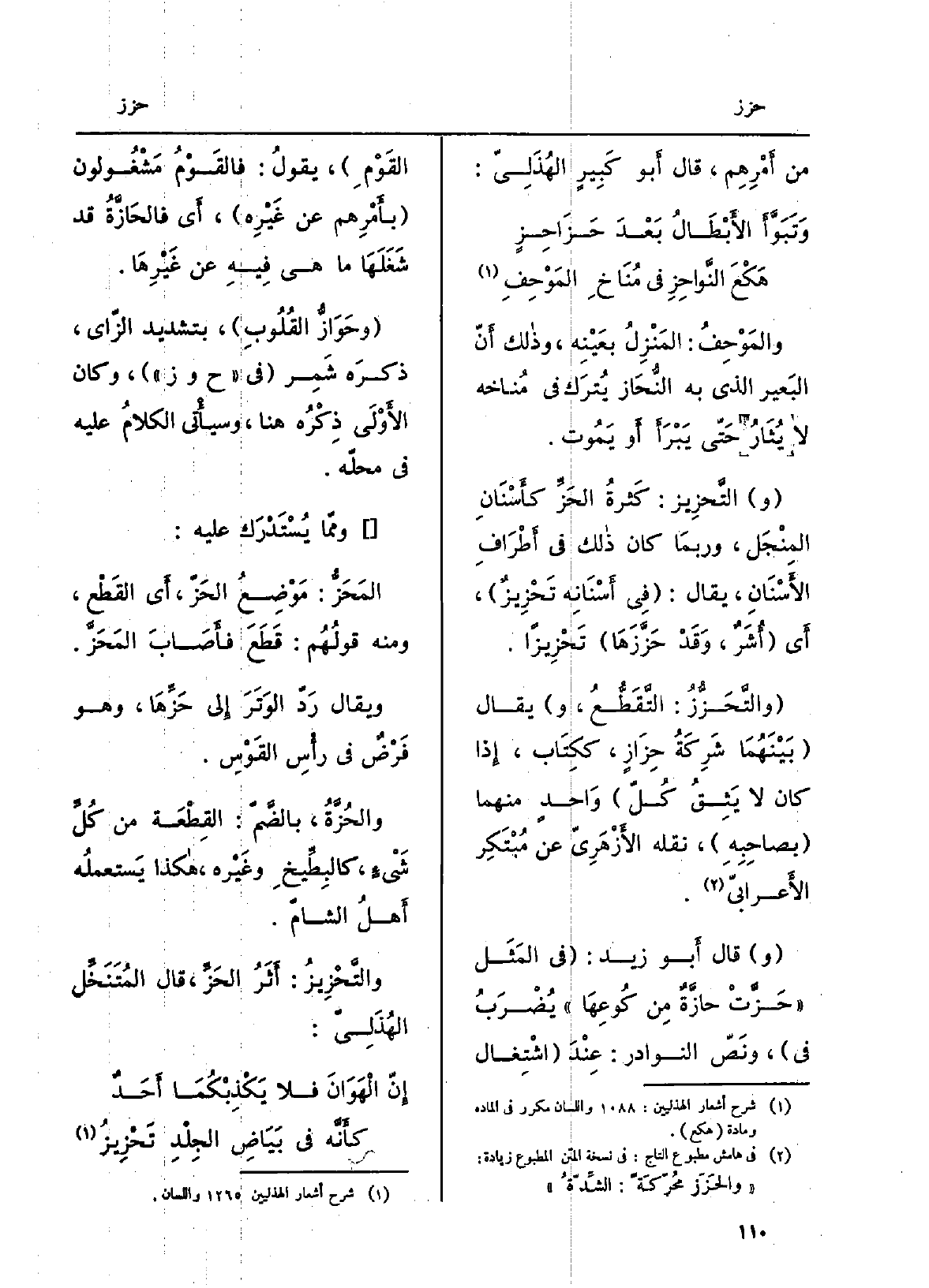 والمَوْحِف: المَنزِلُ بعَيْنِه، وَذَلِكَ أنّ الْبَعِير الَّذِي بِهِ النُّحاز يُترَك فِي مُناخه لَا يُثْأَرُ حَتَّى يَبْرَأ أَو يَمُوت.} التَّحْزيز: كَثْرَةُ الحَزِّ كأَسْنانِ المِنْجَل، وَرُبمَا كَانَ ذَلِك فِي أَطْرَافِ الأَسْنان، يُقَال: فِي أسنانِه {تَحْزِيزٌ، أَي أُشَرٌ، وَقد} حَزَّزَها {تَحْزِيزاً.} والتَّحَزُّز: التَّقَطُّع، وَيُقَال بَينهمَا شَرِكَةُ {حِزازٍ، ككِتاب، إِذا كَانَ لَا يَثِقُ كلُّ واحدٍ مِنْهُمَا بصاحبِه، نَقله الأَزْهَرِيّ عَن مُبْتَكِر الأَعْرابيّ. قَالَ أَبُو زَيْد: فِي المثَل:} حَزَّت {حازَّةٌ مِن كُوعِها. يُضرَبُ فِي، ونصّ النَّوَادِر: عندَ اشْتِغال القومِ، يَقُول: فالقومُ مَشْغُولون بأمرِهم عَن غَيْرِه، أَي} فالحازَّةُ قد شَغَلَها مَا هِيَ فِيهِ عَن غَيْرِها. {وحَوازُّ الْقُلُوب، بتَشْديد الزايّ، ذكره شَمِرٌ فِي حوز، وَكَانَ الأَوْلى ذِكرُه هُنَا، وَسَيَأْتِي الكلامُ عَلَيْهِ فِي محلِّه. ومِمّا يُسْتَدْرَك عَلَيْهِ:} المَحَزُّ: مَوْضِعُ الحَزّ، أَي القَطع، وَمِنْه قولُهم: قَطَعَ فأصابَ المَحَزَّ. وَيُقَال رَدّ الوَتَرَ إِلَى {حَزِّها، وَهُوَ فَرْضٌ فِي رَأْسِ القَوس.} والحُزَّة، بالضمّ: القِطعةُ من كلِّ شيءٍ، كالبِطِّيخ وغيرِه، هَكَذَا يستعملُه أَهْلُ الشَّام. {والتَّحْزيز: أَثَرُ الحَزِّ، قَالَ المُتَنَخِّل الهُذَلِيّ:)