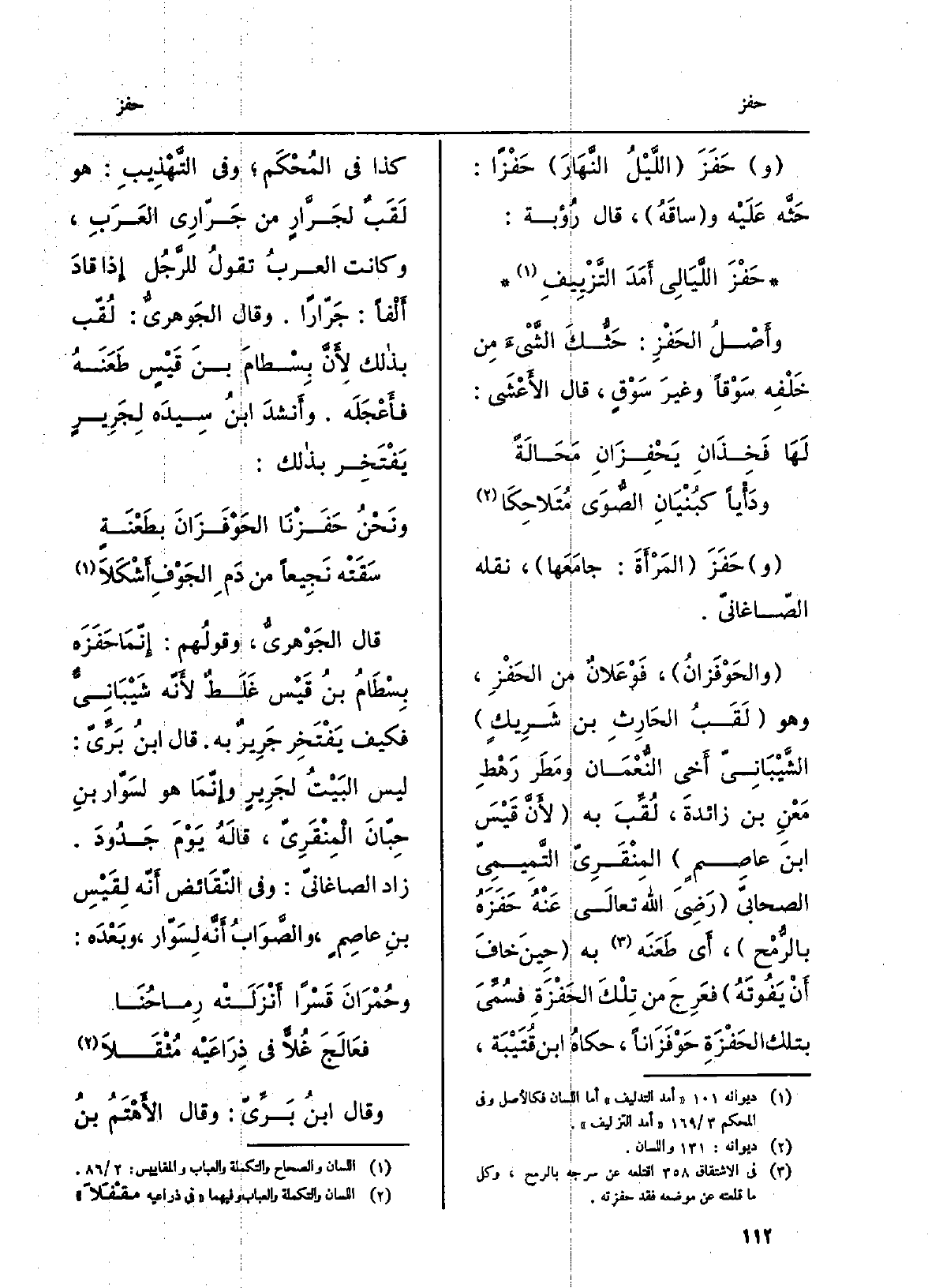 حَفَزَ المرأةَ: جامَعَها، نَقله الصَّاغانِيّ. والحَوْفَزان، فَوْعَلانٌ من الحَفْز، وَهُوَ لقبُ الحارثِ بن شَريكٍ الشَّيْبانيّ أخي النُّعمان وَمَطَر رَهْطِ بن عاصمٍ المِنْقَريّ التَّميميّ الصحابيّ رَضِي اللهُ تَعَالَى عَنهُ حَفْزَهُ بالرُّمْح، أَي طَعَنَه بِهِ حِين خافَ أَن يفُوتَه فعَرِجَ من تِلْكَ الحَفْزَةِ فسُمِّي بِتِلْكَ الحَفْزَةِ حَوْفَزَاناً، حَكَاهُ ابْن قُتَيْبة، كَذَا فِي المُحكم وَفِي التَّهْذِيب: هُوَ لقبٌ لجَرَّارٍ من جَرَّاري العربِ، وَكَانَت العربُ تقولُ للرجل إِذا قاد أَلْفَاً: جَرّاراً. وَقَالَ الجَوْهَرِيّ: لُقِّب بذلك لأنّ بِسْطامَ بن قيسٍ طَعَنَه فَأَعْجَلَه. وَأنْشد ابنُ سِيدَه لجَريرٍ يفتَخِرُ بذلك:)