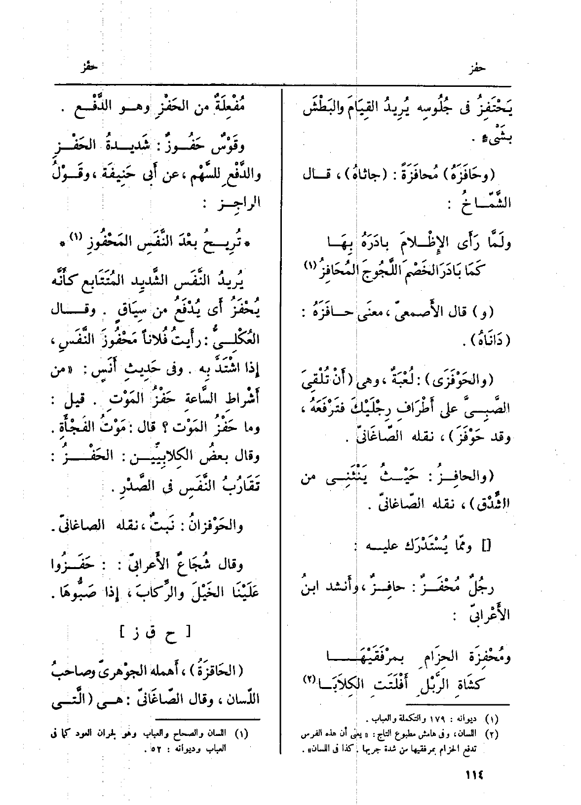 مُفْعِلَةٌ من الحَفْزِ وَهُوَ الدَّفْع. وقَوسٌ حَفُوزٌ: شديدةُ الحَفْز والدَّفعِ للسَّهم، عَن أبي حنيفَة، وقَولُ الراجز: تُريحُ بَعْدَ النَّفَسِ المَحْفوزِ يريدُ النَّفَس الشَّديد المُتتابِعَ كأنّه يُحْفَزُ أَي يُدفَعُ من سِياقٍ. وَقَالَ العُكْلِيُّ: رأيتُ فلَانا مَحْفُوزَ النَّفَسِ: إِذا اشتدَّ بِهِ. وَفِي حَدِيث أنسٍ: من أشراطِ الساعةِ حَفْزُ المَوتِ. قيل: وَمَا حَفْزُ المَوت قَالَ: مَوْتُ الفَجْأَةِ وَقَالَ بعضُ الكِلابيِّين: الحَفْزُ تَقارُبُ النَفَسِ فِي الصَّدر. والحَوْفَزان: نَبتٌ، نَقله الصَّاغانِيّ. وَقَالَ شُجاعٌ الأَعرابيّ: حَفَزوا عَلَيْنا الخَيلَ والرِّكاب: إِذا صَبُّوها. (