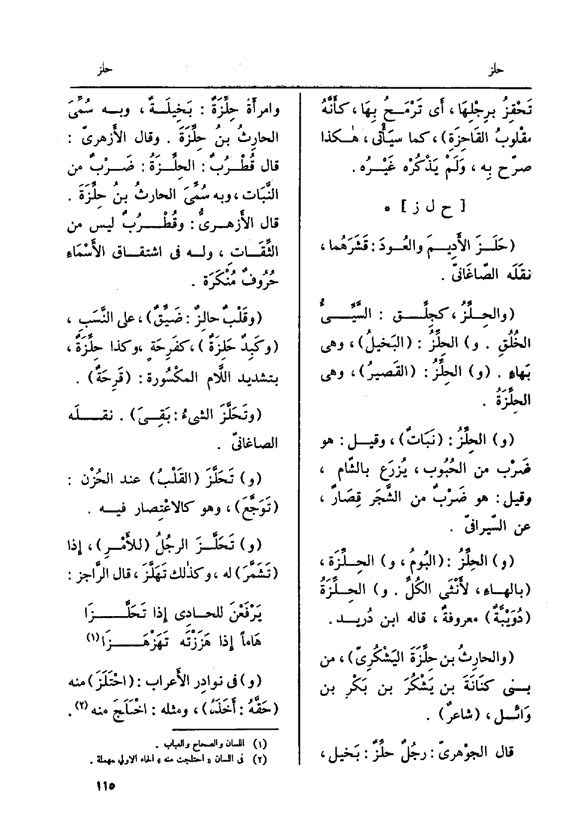 حَلَزَ الأَديمَ والعُودَ: قَشَرَهُما، نَقله الصَّاغانِيّ. والحِلِّز، كجِلِّق: السَّيِّئُ الخُلُق. الحِلِّز: الْبَخِيل، وَهِي بهاءٍ. الحِلِّز: الْقصير، وَهِي الحِلِّزَة. الحِلِّزُ: نباتٌ، وَقيل: هُوَ ضَرْبٌ من الحُبوب، يُزرَع بِالشَّام، وَقيل: هُوَ ضَرْبٌ من الشجرِ قِصارٌ، عَن السّيرافيّ. الحِلِّز: البُوم، والحِلِّزَة، بالهاءِ، لأَنْثى الكلِّ. الحِلِّزَة: دُوَيْبَّةٌ معروفةٌ، قَالَه ابنُ دُرَيْد. والحارثُ بن حِلِّزَةَ اليَشْكُريّ، من بني كِنانةَ بن يَشْكُرَ بن بَكْرِ بن وَائِل، شاعرٌ. قَالَ الجَوْهَرِيّ: رجلٌ حِلِّزٌ: بخيل، وامرأةٌ حِلِّزَةٌ: بخيلةٌ، وَبِه سُمِّي الحارثُ بن حِلِّزَة. وَقَالَ الأَزْهَرِيّ: قَالَ قُطرُبٌ: الحِلِّزَة: ضَرْبٌ من النَّبَات، وَبِه سُمِّي الحارثُ بن حِلِّزَة. قَالَ الأَزْهَرِيّ: وقُطرُبٌ لَيْسَ من الثِّقات، وَله فِي اشتِقاقِ الأسماءِ حروفٌ مُنكَرَةٌ. وقَلْبٌ حالِزٌ: ضَيِّقٌ، على النَّسَب، وكَبِدٌ حَلِزَةٌ، كفَرِحَةٍ، وَكَذَا حِلِّزَةٌ بتَشْديد اللَّام المَكسورة: قَرِحَةٌ. وَتَحَلَّزَ الشيءُ: بَقِيَ. نَقله الصَّاغانِيّ. تحَلَّزَ القَلبُ عِنْد الحُزن: توَجَّع، وَهُوَ كالاعتِصارِ فِيهِ. تحَلَّزَ الرجلُ للأمرِ، إِذا تشَمَّرَ لَهُ، وَكَذَلِكَ تهَلَّزَ، قَالَ الراجز: