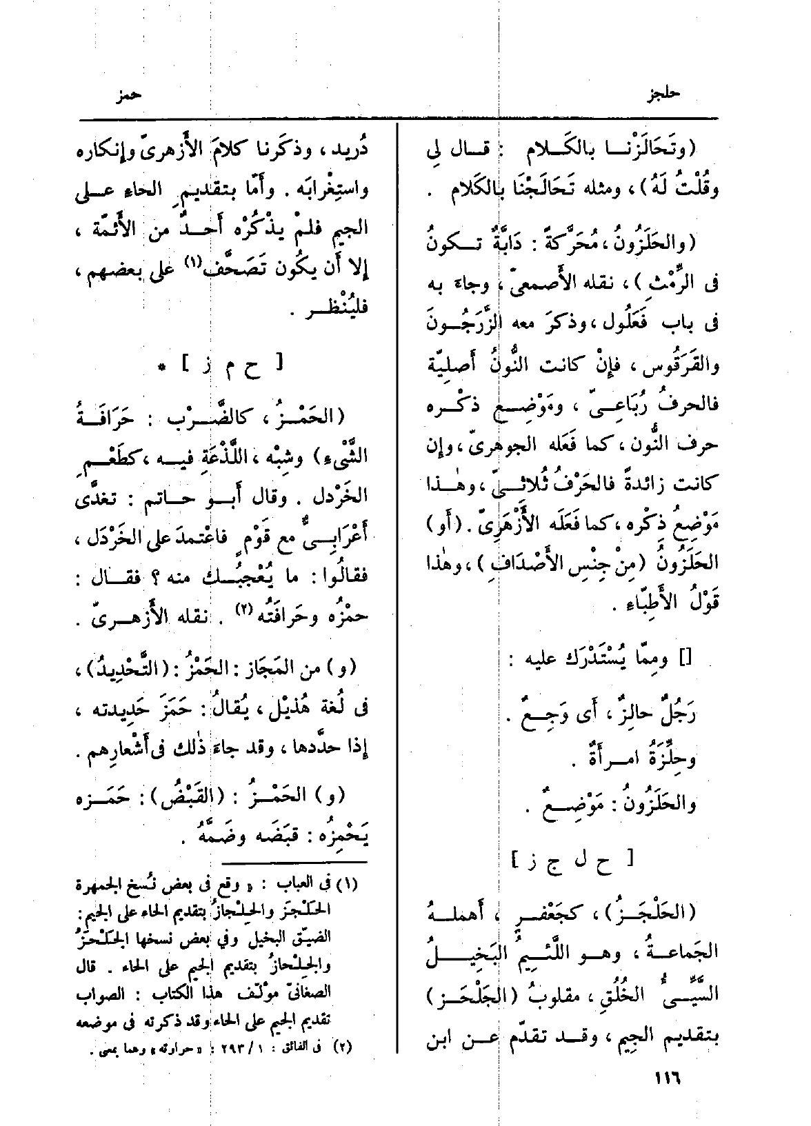 لَهُ، وَمثله تَحالَجْنا بالْكلَام. والحَلَزُون، مُحرّكةً: دابَّةٌ تكونُ فِي الرِّمْثِ، نَقله الأَصْمَعِيّ، وجاءَ بِهِ فِي بَاب فَعَلُول، وَذكر مَعَه الزَّرَجُون والقَرَقُوس، فإنْ كَانَت النونُ أصليّة فالحرفُ رُباعيّ، ومَوْضِعُ ذِكره حرف النُّون، كَمَا فَعَلَه الجَوْهَرِيّ، وَإِن كَانَت زَائِدَة فالحرفُ ثُلاثيّ، وَهَذَا مَوْضِعُ ذِكْره، كَمَا فَعَلَه الأَزْهَرِيّ. أَو الحَلَزُون من جِنسِ الأَصْدافِ، وَهَذَا قَوْلُ الْأَطِبَّاء. ومِمّا يُسْتَدْرَك عَلَيْهِ: رجلٌ حالِزٌ: أَي وَجِعٌ. وحِلِّزَةُ امرأةٌ. والحَلَزُون: مَوْضِعٌ.