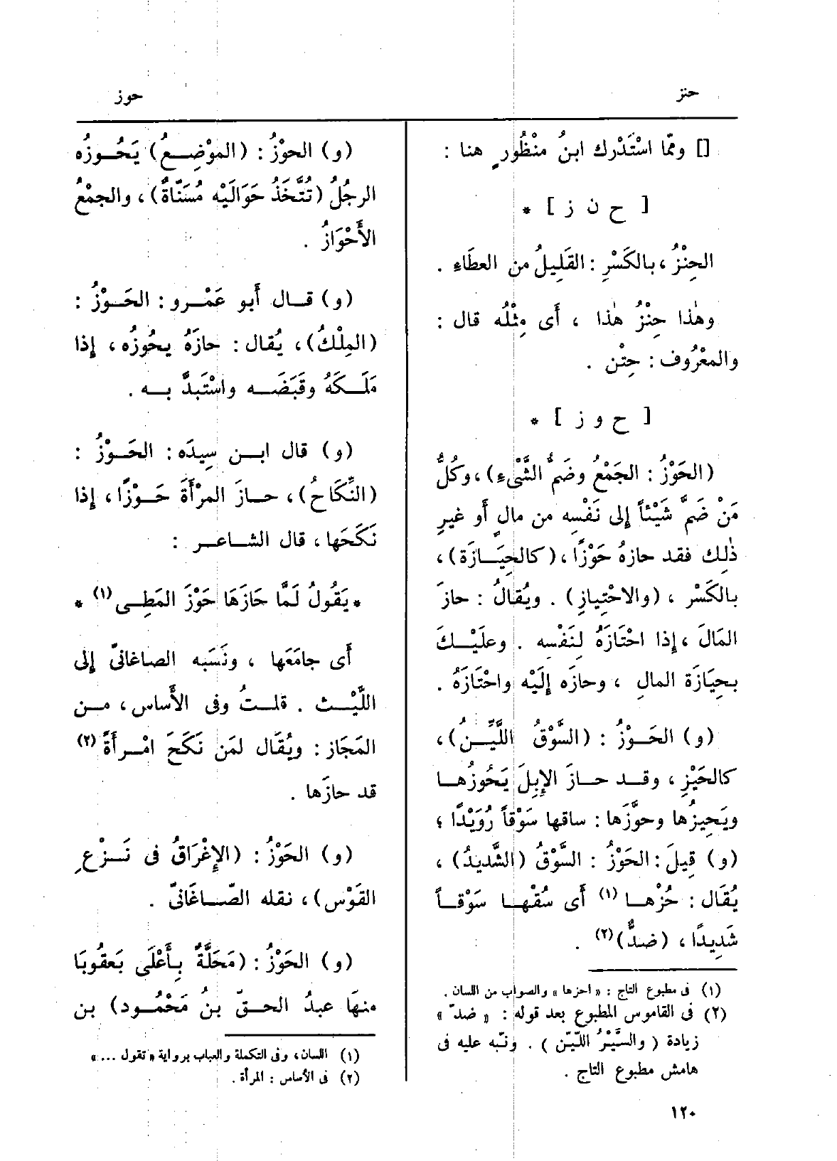 {الحَوْز: الجَمعُ وضَمُّ الشيءِ، وكلُّ مَن ضمَّ شَيْئا إِلَى نَفْسِه من مالٍ أَو غيرِ ذَلِك فقد} حازَه {حَوْزَاً،} كالحِيازَة، بِالْكَسْرِ، {والاحْتِياز. وَيُقَال: حازَ المالَ، إِذا} احْتازَه لنَفسِه. وعليكَ {بحِيازَةِ المالِ،} وحازَه إِلَيْهِ {واحْتازَه. الحَوْز: السَّوْقُ اللَّيِّنُ،} كالحَيْز، وَقد {حازَ الإبلَ يحُوزُها} ويَحيزُها {وحوَّزَها: ساقَها سَوْقَاً رُوَيْداً قيل:} الحَوْز: السَّوْقُ الشَّديد. يُقَال: {حُزْها أَي سُقْها سَوْقَاً شَدِيدا، ضدٌّ. الحَوْز: المَوضِعُ يحُوزُه الرجلُ تُتَّخَذُ حوالَيْه مُسَنّاة، والجمعُ} الأَحْواز. (و) قَالَ أَبُو عَمْرُو: الحَوْز: المِلْك، يُقَال: {حازَه} يَحُوزُه، إِذا مَلَكَه وقَبَضَه واستبَدَّ بِهِ. قَالَ ابنُ سِيدَه: {الحَوْز: النِّكاح.