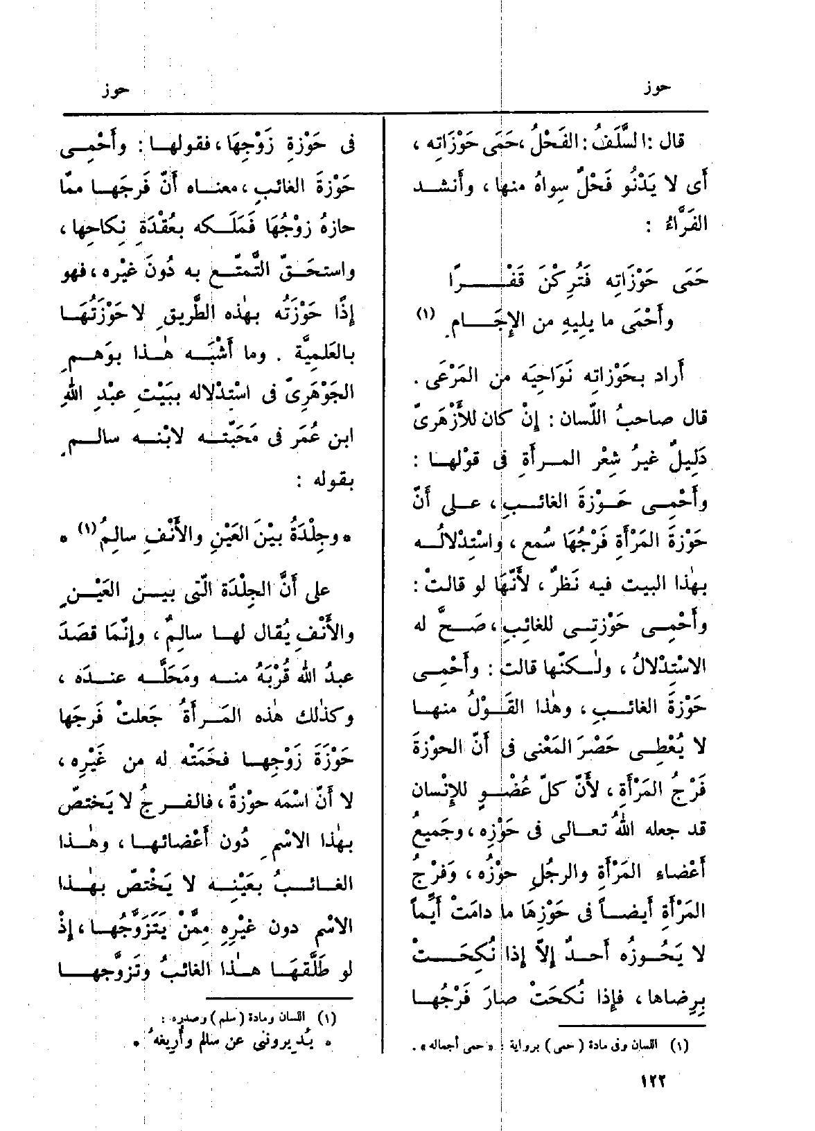 أَرَادَ} بحَوْزَاتِه نَواحيه من المَرعى. قَالَ صاحبُ اللِّسان: إِن كَانَ للأزهريّ دليلٌ غيرُ شِعر المرأةِ فِي قولِها: وأَحمي حَوْزَةَ الغائبِ، على أنّ حَوْزَةَ المرأةِ فَرْجُها سُمع، واستِدْلالُه بِهَذَا الْبَيْت فِيهِ نَظَرٌ، لأنّها لَو قَالَت: وأحمي {- حَوْزَتي للْغَائِب، صَحَّ لَهُ الاسْتِدلال، وَلكنهَا قَالَت: وأحمي حَوْزَةَ الْغَائِب، وَهَذَا القولُ مِنْهَا لَا يُعطي حَصْرَ الْمَعْنى فِي أنّ الحَوْزَةَ فَرْجُ المرأةِ.