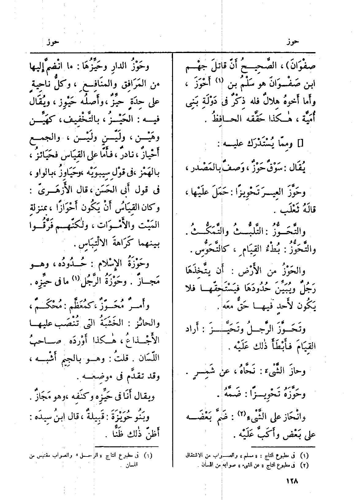 صَفْوَان، الصحيحُ أنّ قاتلَ جَهْم بن صَفْوَان هُوَ سَلْمُ بن أَحْوَزَ، وَأما أَخُوهُ هلالٌ فَلهُ ذِكرٌ فِي دَوْلَةِ بني أُميّة، هَكَذَا حقّقه الْحَافِظ. ومِمّا يُسْتَدْرَك عَلَيْهِ: يُقَال: سَوْقٌ حَوْزٌ، وَصفٌ بِالْمَصْدَرِ. {وحَوَّزَ العِيرَ} تَحْوِيزاً: حَمَلَ عَلَيْهَا، قَاَلَه ثَعْلَب. {والتَّحَوُّز: التَّلَبُّثُ والتَّمَكُّث.} والتَّحَوُّز: بُطءُ القِيامِ، كالتَّحَوُّس. والحَوْزُ من الأَرْض: أَن)